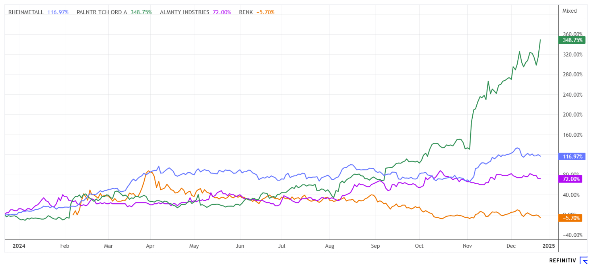 Nach über 1.000 Tagen Krieg in Europa werden Defense- und Rüstungstitel weiterhin im Fokus stehen. Rheinmetall und Palantir haben in 2024 von diesen Trends stark profitiert, wir sehen hier eher Chancen auf der Verkaufs- oder Shortseite. Renk hingegen sollte sich schon bald wieder von seinem Abwärtstrend lösen können. Im Bereich strategischer Metalle könnte Almonty Industries mit Blick auf die nächsten 12 bis 24 Monate ein klarer Outperformer sein.