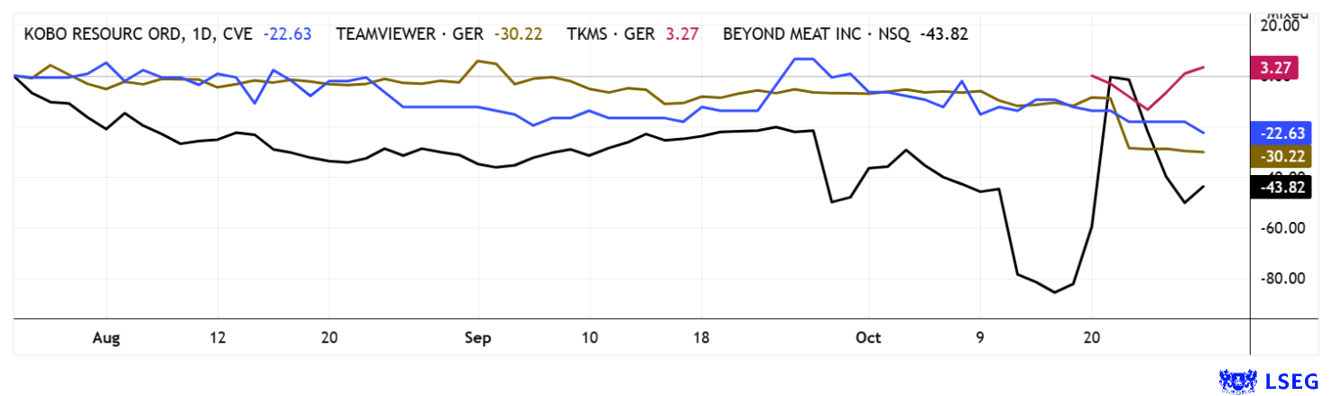Die Börse wirft Licht und Schatten. Positives gibt es über TKMS zu berichten, hier gibt es Bewegung im Auftragseingang. TeamViewer muss seine Ziele erneut nach unten korrigieren, Anleger trennen sich massiv von der Aktie. Beim Meme-Titel Beyond Meat regieren die Trading-Algos und Kobo Resources meldet gute Bohrergebnisse. Anleger können die aktuelle Gold-Korrektur hier zum smarten Einstieg nutzen.