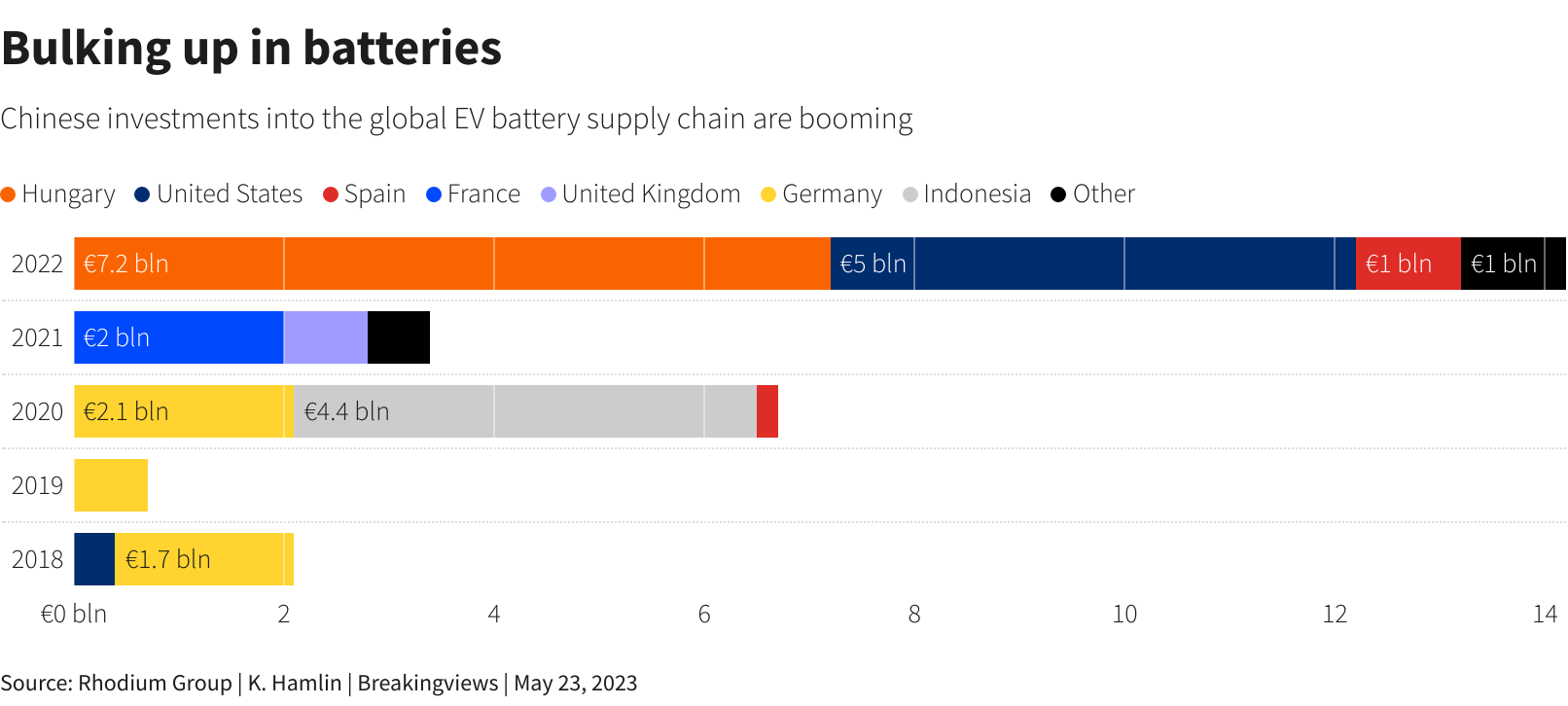 Mehr als jedes 5. Auto, das im vergangenen Jahr in Europa verkauft wurde, war ein Elektroauto. Damit ist die Region nach China der zweitgrößte Markt für E-Fahrzeuge weltweit. Dies eröffnet den Batterieherstellern aus der Volksrepublik eine vielversprechende neue Chance, da sie bereits europäische Marken wie Volkswagen, BMW und Stellantis sowie globale Unternehmen wie Geely, den Eigentümer von Volvo, beliefern. Eine übermäßige Abhängigkeit von chinesischen Marktführern wie CATL und seinen Wettbewerbern könnte jedoch ein Risiko darstellen. Laut einem Bericht des Mercator Institute for China Studies stiegen Chinas weltweite Investitionen in die Lieferkette für Elektroauto-Batterien von 3,4 Mrd. EUR in 2021 auf 14,2 Mrd. EUR im Jahr 2022. Von den Gesamtinvestitionen entfielen 8,2 Mrd. EUR auf Ungarn und Spanien zusammen (siehe Grafik).