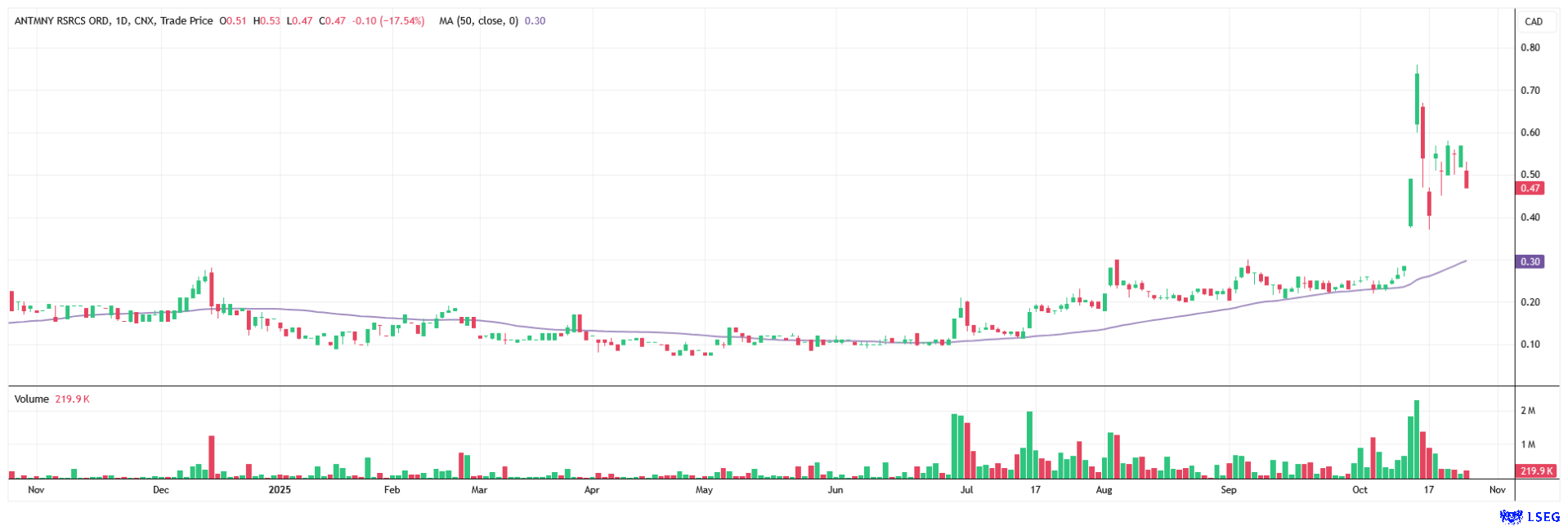 Im laufenden Jahr hat Antimony eine umfangreiche Bohrkampagne gestartet. Phase I erstreckte sich über 16 Löcher mit einer Strecke von 3.150 m und lieferte zahlreiche Vorkommen. Beispiele sind etwa 4,17 % Sb über 7,4 m oder 14,91 % Sb über 3,0 m. Kürzlich startete Phase II, die weitere 6.000 m Bohrungen vorsieht. Dabei entdeckte das Team eine zweite Mineralisierungszone rund 450 m entfernt vom Hauptbereich. Das weckte bei Beobachtern die Hoffnung auf umfassende Vorkommen. Aus Investorensicht steht Antimony Resources für eine geringere Abhängigkeit der USA von Antimon-Importen. Sollte Bald Hill wirklich brauchbare Mengen liefern, würde das die Abhängigkeit von China mindern. Vergleichbare Projekte gibt es kaum - in den USA ruht derzeit die Produktion des Elements, das in vielen Volkswirtschaften der Welt als kritisch gilt und daher besonders beachtet wird.