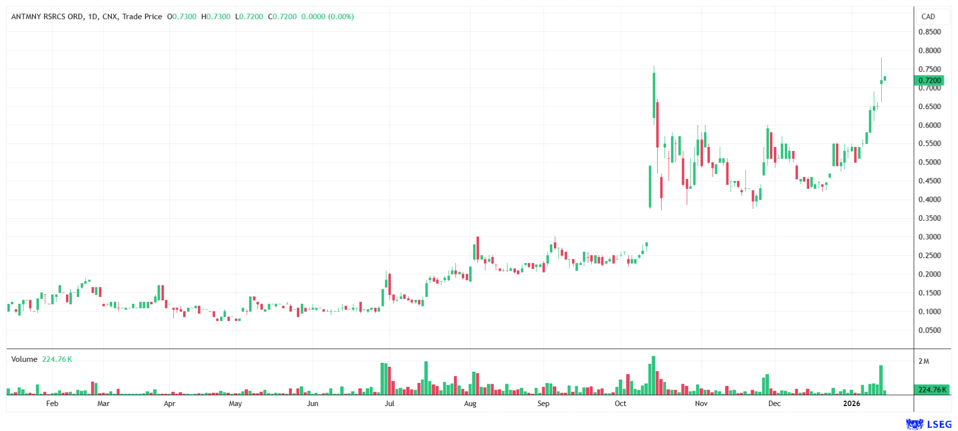 Ende 2025 schloss das Unternehmen eine Finanzierung über rund 9,4 Mio. CAD ab. „Diese Beschränkungen Chinas haben die Marktvolatilität verstärkt und die Preise auf ein Allzeithoch getrieben. Antimon ist für das Militär unverzichtbar. Unser Ziel ist es, unsere Antimonlagerstätte Bald Hill zu erschließen und ein wichtiger Lieferant von Antimon für Nordamerika zu werden.“, so Atkinson. Dieses Kapital sichert das ehrgeizige Explorationsprogramm für 2026 ab, das 10.000 m Bohrungen mit bis zu drei Bohrgeräten vorsieht.