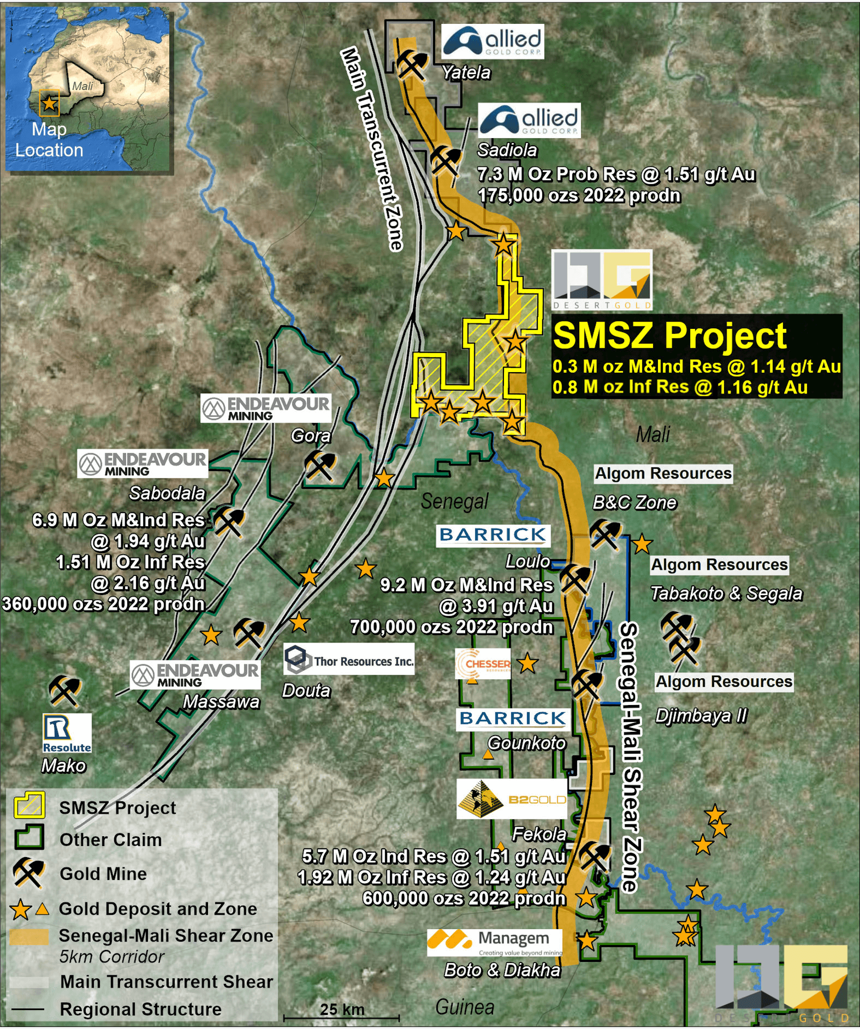 Desert Gold Ventures besitzt ein Gold-Portfolio von 440 qkm Lizenzen und somit eines der größten zusammenhängenden dieser Art in Westafrika. Mit Blick auf die Karte zwingt sich der Vergleich mit einem Puzzle auf. Das Areal von Desert Gold Ventures gewinnt nicht nur aufgrund der Größe an Bedeutung, sondern vielmehr durch die aktiven namhaften Nachbarn mit Goldproduktion drumherum. Ein Übernahmeszenario ist somit naheliegend für die Investoren des Goldunternehmens, das bereits 1,1 Mio. Unzen nachgewiesen hat. Mit einem aktuellen Börsenwert von 12 Mio. CAD ist die Unze Gold im Boden mit weniger als 10 USD bewertet - der Preis der Feinunze Gold notiert auf dem Weltmarkt hingegen bei über 2.000 USD.