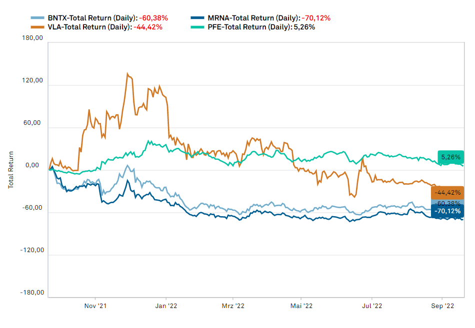 Die Marktkapitalisierung des Ein-Produkt-Unternehmens liegt aktuell bei 32,39 Mrd. USD. Ein mögliches Wegbrechen der Vakzin-Umsätze dürfte die Mainzer schwer treffen. Zwar sind bereits mehrere Therapien, vor allem in der Krebsforschung, in der Pipeline, ein zweites kommerzielles Produkt neben dem Impfstoff ist jedoch zeitnah eher nicht zu erwarten.