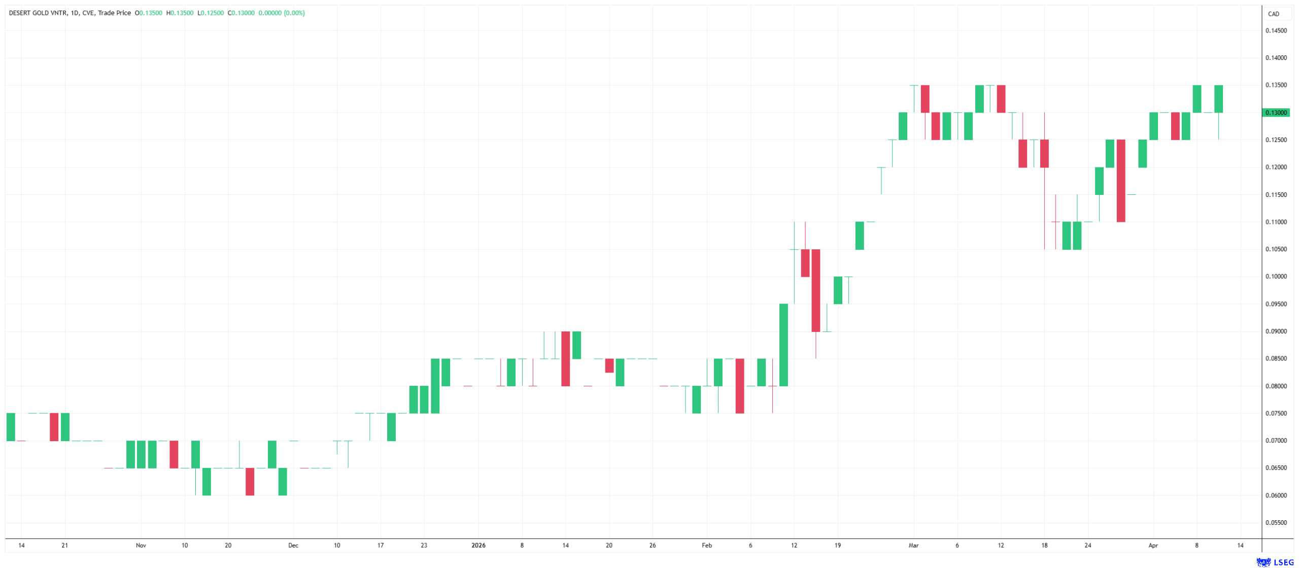 Eine aktualisierte Wirtschaftlichkeitsstudie bescheinigt dem Projekt bereits bei einem Basis-Goldpreis von 2.850 USD einen Nettobarwert von 61 Mio. USD, der beim aktuellen Spotpreis von über 4.000 USD auf beachtliche 124 Mio. USD steigt. Die Analysten von GBC Research erkennen dieses Potenzial und bewerten die Aktie mit einer klaren Kaufempfehlung sowie einem fairen Wert von 0,69 CAD. Aktuell notiert die Aktie deutlich darunter bei lediglich rund 0,13 CAD. In einem Umfeld, in dem Schwergewichte ihre Reserven in der Region dringend aufstocken müssen, positioniert sich Desert Gold entweder als idealer Übernahmekandidat oder als hochprofitabler Produzent – nachdem das Unternehmen erfolgreich in Produktion gegangen ist, wird Desert Gold weitere Aufmerksamkeit auf sich ziehen. Spekulativ denkende Investoren können sich bereits zuvor positionieren. Das Marktumfeld für Gold aus Mali hellt sich seit Monaten auf. Investoren können sich das zunutze machen.