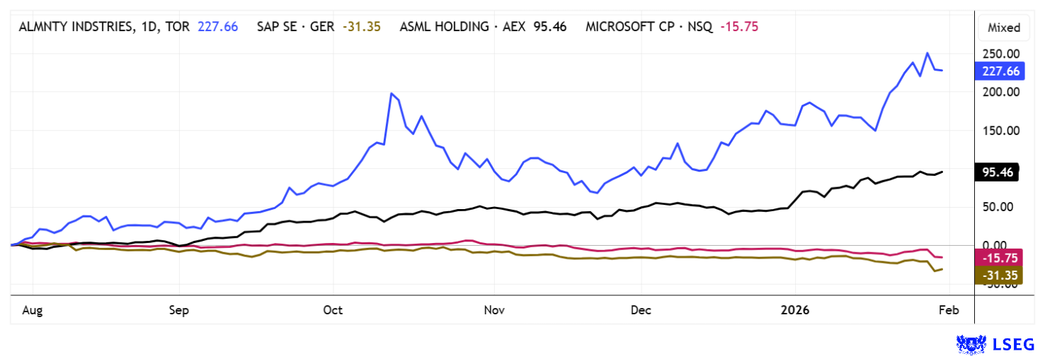 Ein Abnehmer kritischer Metalle ist auch der niederländische Lithographie- und Halbleiterspezialist ASML. Das Unternehmen hat in den letzten 10 Jahren eine erstaunliche Entwicklung durchgemacht und zählt heute zu den Kern-Unternehmen der gesamten Chip- und Hightechbranche. Rekordzahlen von TSMC und die Ankündigung über weitere Investitionen in schwindelerregender Höhe ließen vermuten, dass auch die vorgelagerte ASML so schnell nicht in ein Nachfrageproblem laufen würde. Schließlich sind die Anlagen der Niederländer für modernste Fertigungsprozesse unverzichtbar, weshalb auf der Kundenliste alle großen Namen aus westlichen Gefilden zu finden sind. Allein in Q4 konnte ASML einen Auftragseingang von 13,2 Mrd. EUR verzeichnen, die Erwartungen lagen ganze 50 % tiefer. Der Auftragsbestand schwillt auf 39 Mrd. EUR an, mehr als man mit 32 Mrd. EUR in 2025 umgesetzt hat. Dabei erzielen die Niederländer auch noch eine operative Marge von 35 %.