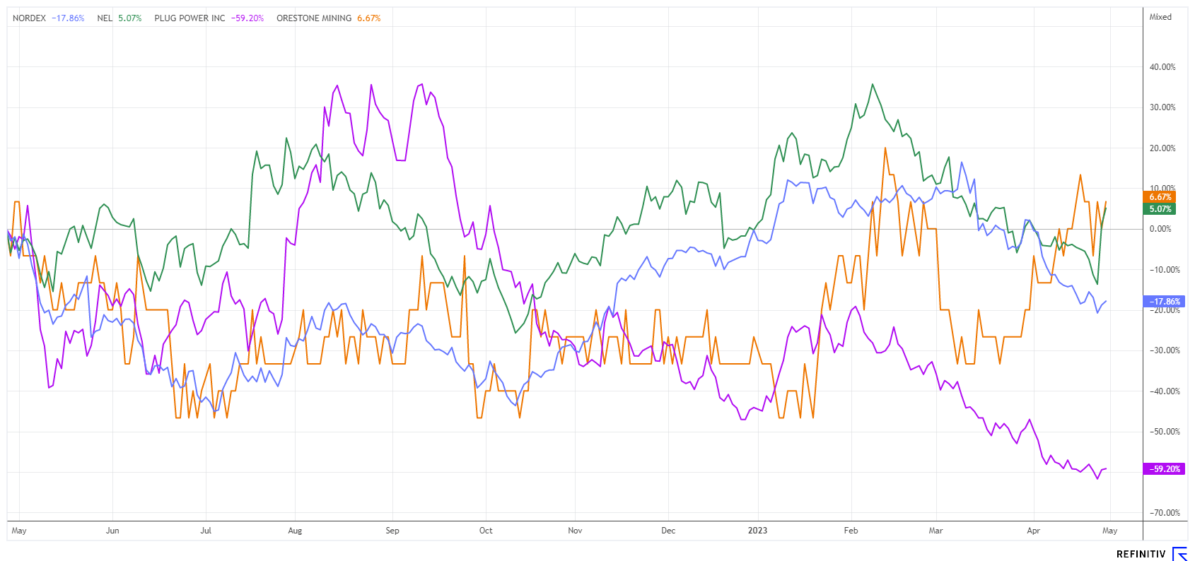 Bei Nel ASA fielen die Zahlen schlechter aus als erwartet. Der Konzern brilliert aber mit einem großen Auftrags- und Kassenbestand von 4,2 Mrd. NOK. Im ersten Quartal erhöhte sich der Umsatz um 68 % auf 359 Mio. NOK. Leider landete der Nettogewinn wegen hoher Investitionen und Abschreibungen mit 192 Mio. NOK im Abseits. Hier hilft es aber durchaus, dass die Neuaufträge mit +161 % auf 555 Mio. NOK nach wie vor stark vorankommen. Der Konkurrent PlugPower kommt derzeit gar nicht auf die Füße, denn neben enttäuschenden Zahlen zum Jahr 2022 gibt es auch noch eine Sammelklage gegen den CEO Andy Marsh, da tausende von Anlegern durch viel zu optimistische Aussagen der letzten Jahre in die Irre geführt wurden, und so in der Aktie über 80 % Kurseinbruch erlitten.