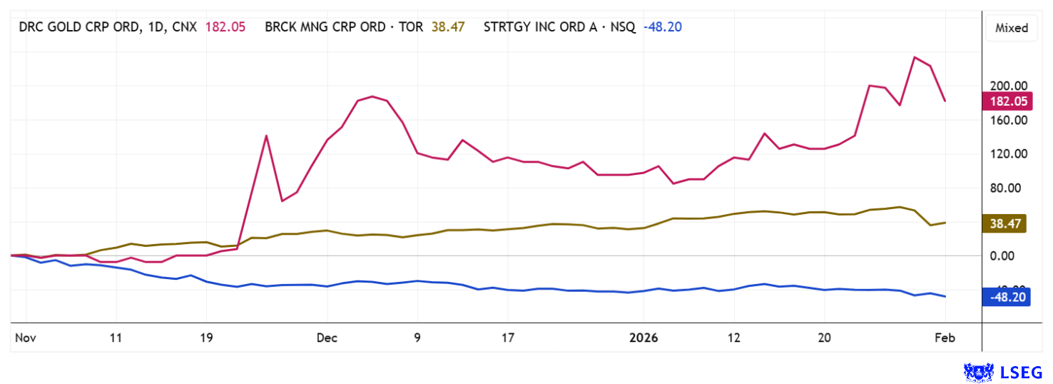 RUMS! So schnell konnten Anleger gar nicht reagieren, wie am Freitag die Kurse für Gold und Silber in den Abgrund fielen. Erklärungen für diesen Abverkauf gab es viele: Da waren die Derivate-Positionen von Großbanken, die bei dem steilen Aufwärtstrend der letzten Wochen richtig schmerzten. Und dann kamen noch einige Spekulanten auf den Plan, denn auch sie wollten etwas abhaben vom Kuchen. Und schließlich auch ein Quäntchen Panik. Silber kollabierte um ganze 40 % von 122 auf 72 USD, während Gold um etwa 1.000 USD oder 20 % auf 4.600 USD korrigierte. Zu Anfang der Woche zeigt sich nun eine zarte Stabilisierung, aber die Volatilität bleibt. Das Umfeld bleibt aber fragil. Ein Lied davon singen können die Goldtitel Barrick Mining und DRC Gold. Blickt man über den Tellerrand auf den Bitcoin, dann rückt ein Verlierer in das Blickfeld: Strategy, das BTC-Asset-Management-Unternehmen von Michael Saylor. Wie geht der Schlamassel weiter?