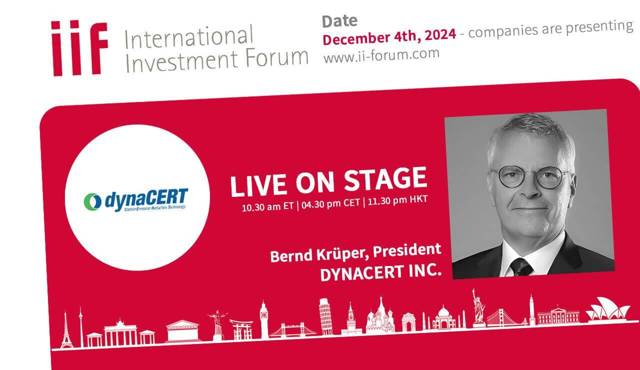 Präsident Bernd Krüper wird am 4. Dezember 2024 im Rahmen des 13.International Investment Forum um 16:30 CET über die neuesten Fortschritte bei dynaCERT berichten und für Fragen zur Verfügung stehen. Hier geht es zur Anmeldung.