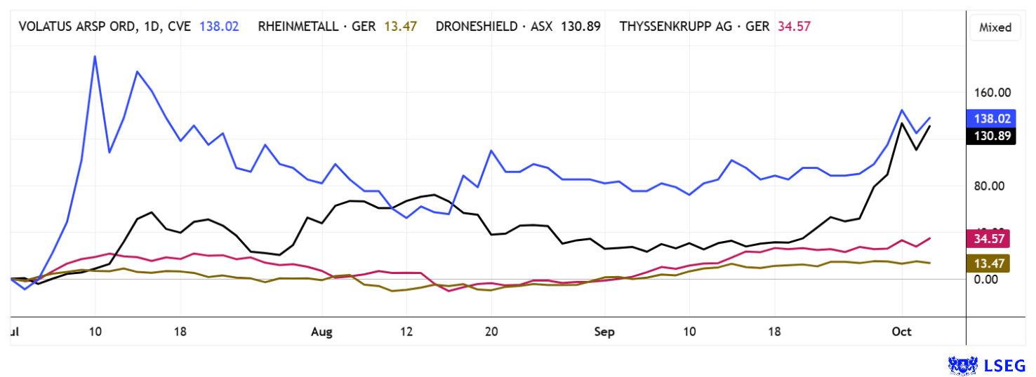 Das Münchener Oktoberfest litt unter einer Bombendrohung und Drohnen kreisten mehrmals über dem Flughafen. Der bayerische Ministerpräsident kündigte ein neues Polizeigesetz an und möchte zusammen mit der Bundeswehr gegen unerwünschte Flugkörper vorgehen. Nach den Zwischenfällen in Polen und dem Baltikum ist die NATO in erhöhter Hab-Achtstellung. An der Börse profitieren können wiederum die Defense-Titel. Ganz besonders die Drohnenwerte Volatus und DroneShield geben Gas. Aber auch bei Rheinmetall und thyssenkrupp geht es weiter flott voran. Gesunde Diversifikation schützt vor großen Portfolio-Ausschlägen.