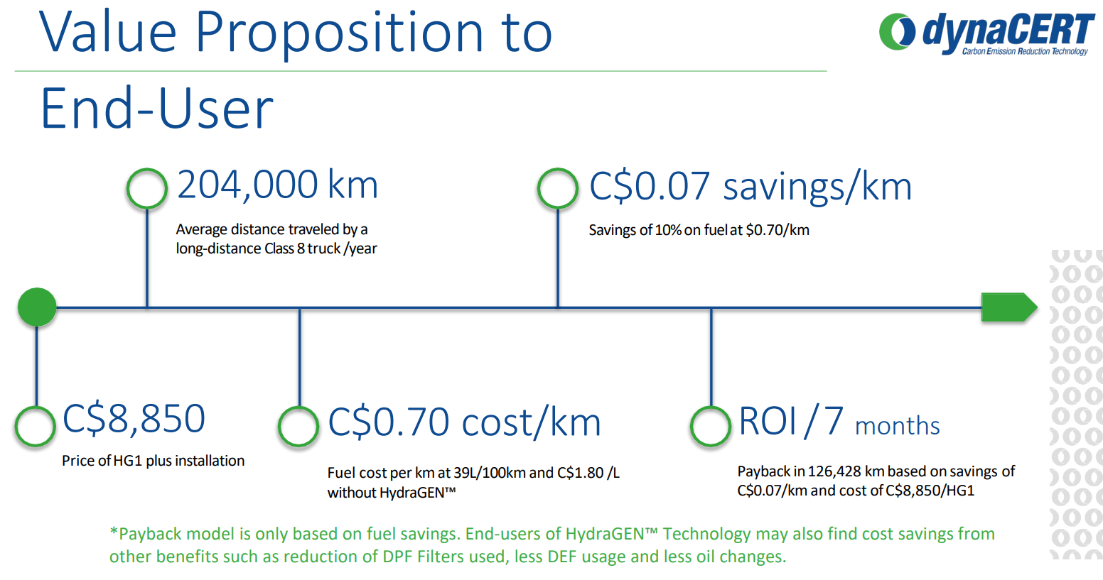 Allein in den USA sind über 13,5 Mio. LKWs unterwegs, in der EU 6 Mio. dynaCERT zielt auf eine schnelle Amortisation für Kunden ab. Bei einem Gerätepreis von ca. 8.850 CAD und Einsparungen von 6 bis 19 % bei Kraftstoffkosten sowie Wartungskosten rechnet sich die Investition laut Unternehmensangaben bereits nach 7 Monaten bei einer Laufleistung von 204.000 km, was dem jährlichen Durchschnitt von Class 8 LKWs entspricht. Hinzu kommen Erlöse aus Carbon Credits, die dynaCERT über seine HydraLytica-Telematik software exakt quantifiziert.
