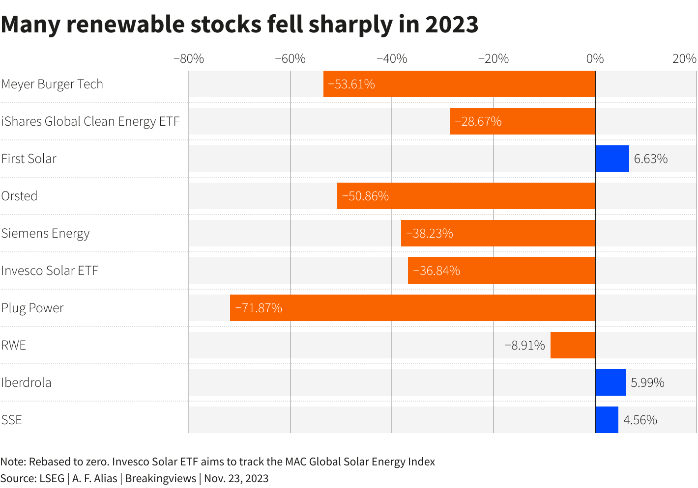 Die Branche der erneuerbaren Energien bleibt für Anleger durchwachsen. Wer auf ETF als Diversifikation innerhalb des Segments setzt, hat auch die schwarzen Schafe mit an Bord. Laut Reuters ist bis Ende November 23 der MAC Global Index der Solarunternehmen (SUNIDX) im selben Jahr um fast 40 % gefallen, und der iShares Clean Energy ETF (ICLN.O) war um fast 30 % gesunken, selbst als die Benchmark-Indizes in Europa und den USA beide stiegen. Investoren sollten daher besser auf Einzelwerte setzen und die makroökonomischen Zusammenhänge berücksichtigen, um wachstumsstarke Unternehmen zu identifizieren. Die Siemens Energy Aktie notiert momentan bei 11,38 EUR. Es bleibt also noch Luft nach oben, um die Analystenschätzung zu erzielen.