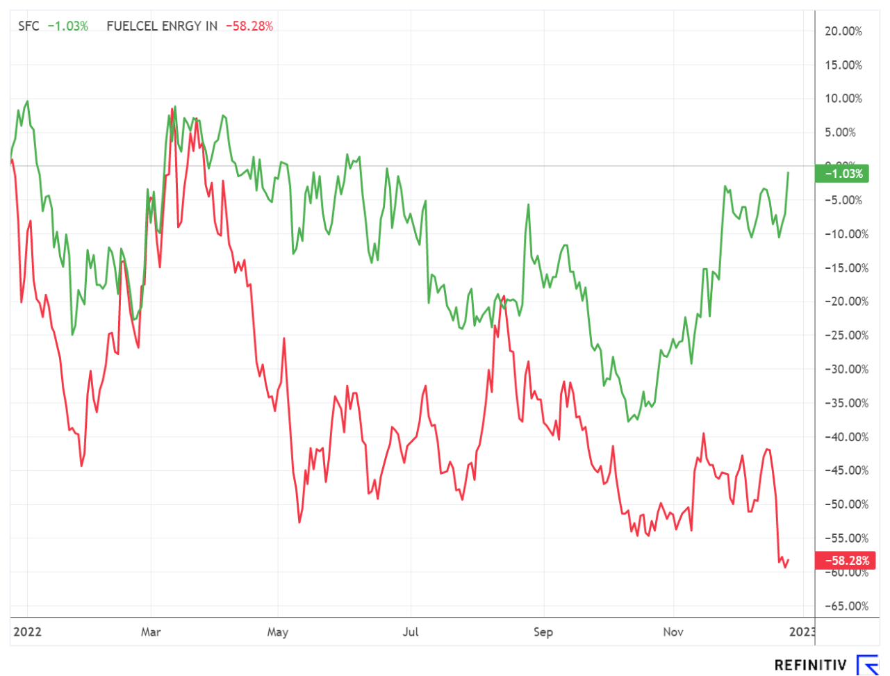 Die überaus starke Entwicklung eines der weltweit führenden Unternehmen für mobile und netzferne Energielösungen in den Geschäftsfeldern Clean Energy & Clean Power Management, SFC Energy, wurde zum Jahresende mit einem Upgrade durch die deutsche Börse belohnt. Mit Wirkung zum 27.12.2022 steigt das Unternehmen aus Brunnthal bei München in den SDAX auf, der die 70 nach Marktkapitalisierung und Börsenumsatz größten Unternehmen der klassischen Branchen unterhalb des MDAX umfasst. Dafür wird Uniper aus dem Index genommen, da der Streubesitz im Zusammenhang mit einer Übernahme unter 10% gesunken ist.