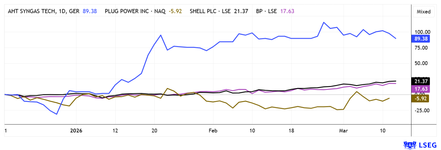 Dass der Iran-Konflikt die Welt aus den Fugen hebt, hätte wohl niemand gedacht. Liegt aber auch an den vollmundigen Worten des Präsidenten, der schon nach Start der kriegerischen Handlungen von einem Blitzkrieg gesprochen hatte. Blödsinn, wie wir nun wissen. Mittelfristig könnte Öl also noch wesentlich teurer werden, das lenkt den Blick der Investoren zunächst auf die Öl-Multis, aber natürlich auch verstärkt auf Unternehmen wie A.H.T. Syngas oder Plug Power, die in solchen Energiekrisen gute technische Alternativen zu den fossilen Brennstoffen bieten können.