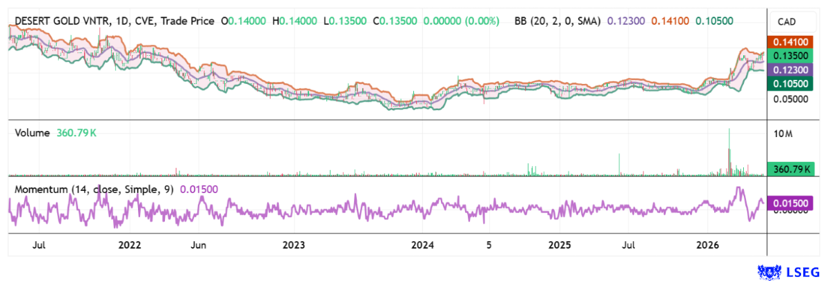 Nach einer Traum-Rally in den letzten 12 Monaten pausierte der Goldpreis knapp unterhalb der 5.000 USD-Marke. Der Grund: Sehr schnell kam es in 2025 bis Januar dieses Jahres zu einer 130 % Aufwertung des Edelmetalls auf 5.400 USD. Knappheiten und derivative Schieflagen vor allem im Silber katapultierten die Preise für physisches Metall nach oben. Bei den meisten Goldminen und fortgeschrittenen Explorern kam es zu Aufwertungen von bis zu 500 %. Desert Gold verdoppelte sich in diesem Zeitraum ebenso, von Investoren wurde aber die gute Ausgangslage für eine Aufnahme der Förderung in 2026 völlig übersehen. Das deutsche Researchhaus GBC setzt ein Kursziel von 0,93 CAD, das ist bei Kursen um 0,14 CAD ein Traum-Potenzial für den kanadischen Developer. Investoren sollten nicht vergessen: Gold-Investments sind ein Hedge-Instrument gegen die geopolitischen Verwerfungen dieser Tage. Es stabilisiert Portfolio-Erträge und fungiert als Kaufkraftgarant über Jahre. Ein tieferer Blick lohnt sich!