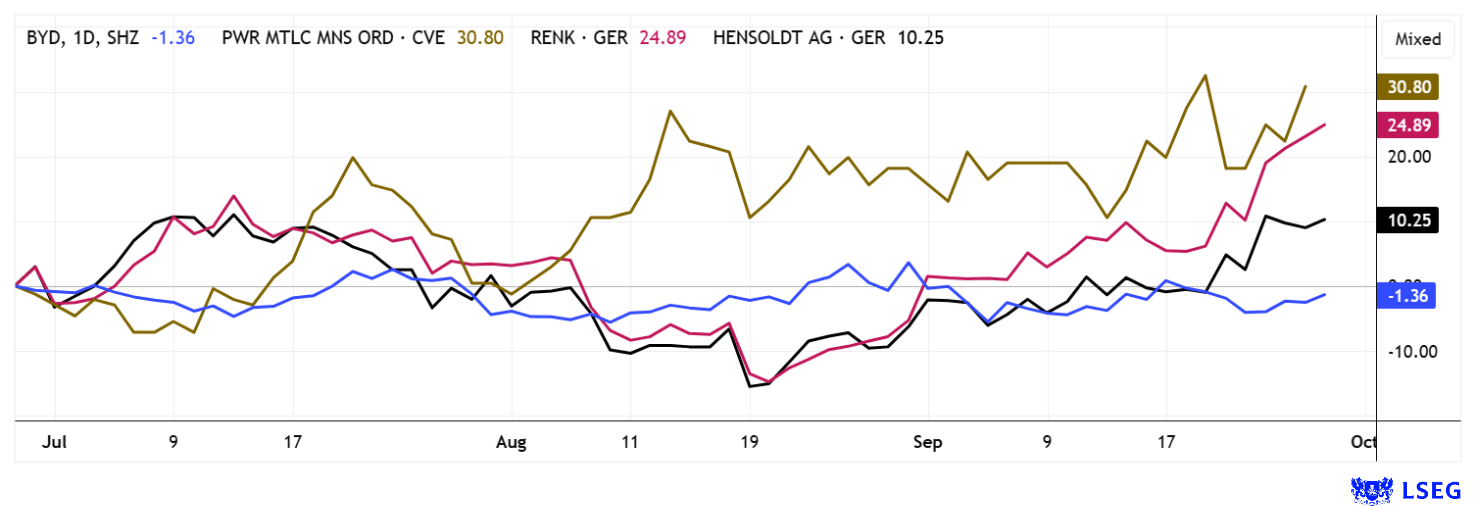 POWER METALLIC MINES INC. | CA73929R1055 , BYD CO. LTD H YC 1 | CNE100000296 , RENK AG O.N. | DE000RENK730 , HENSOLDT AG INH O.N. | DE000HAG0005