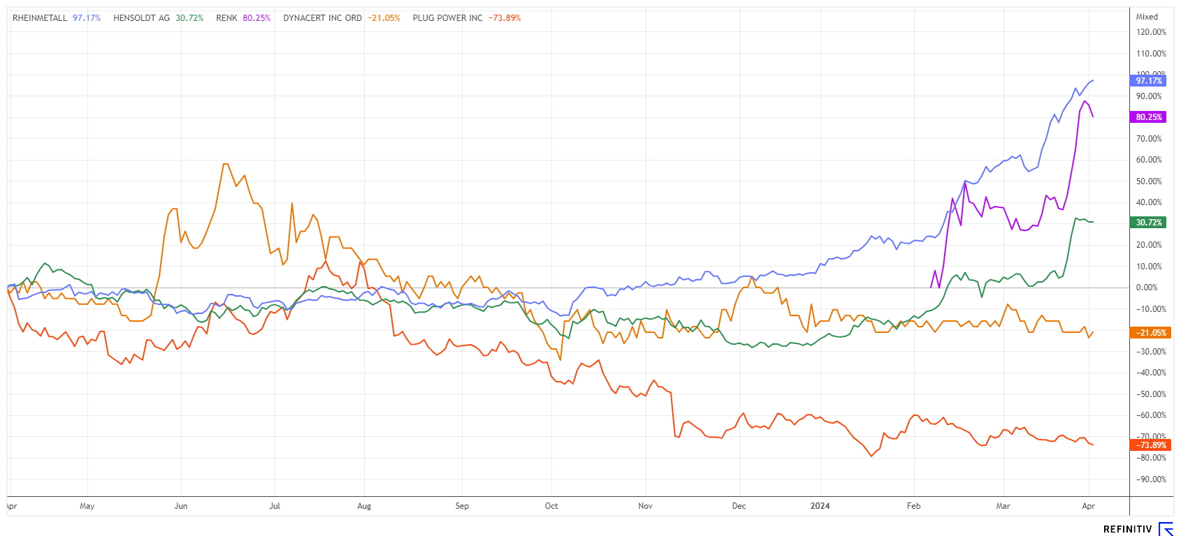 Der Wasserstoff-Sektor träumt aktuell von den Renditen aus dem Rüstungssektor. Derzeit gibt es noch keine Anzeichen, dass die etablierten Trends drehen. Dennoch steht nach einer langen Hausse auch mal eine Branchen-Rotation auf dem Plan. Wer sein Risiko senken möchte, diversifiziert über verschiedene Sektoren und Länder. Stop-Loss-Limite dienen als gute Absicherung gegen plötzliche Umschwünge.
