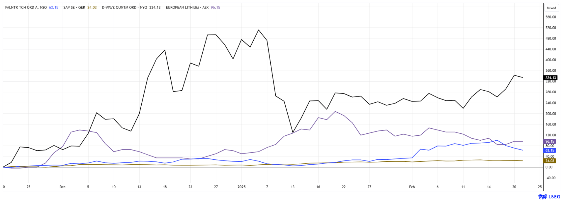 Die Bundestagswahl besitzt Sprengkraft. Denn die Börse hat in den letzten Wochen große Euphorie-Anstiege absolviert. Viele setzten dabei auf den großen „Change“ in der deutschen Politik. Ob dieser nun bei der vorliegenden Ergebniskonstellation auch möglich ist, scheint mehr als fraglich. Highflyer Palantir hat schon mal 25 % eingebüßt, D-Wave kann sich noch gut halten. European Lithium ist ein aussichtsreicher Optionsschein auf einen möglichen Frieden in der Ukraine und einen neuen Elektro-Boom.