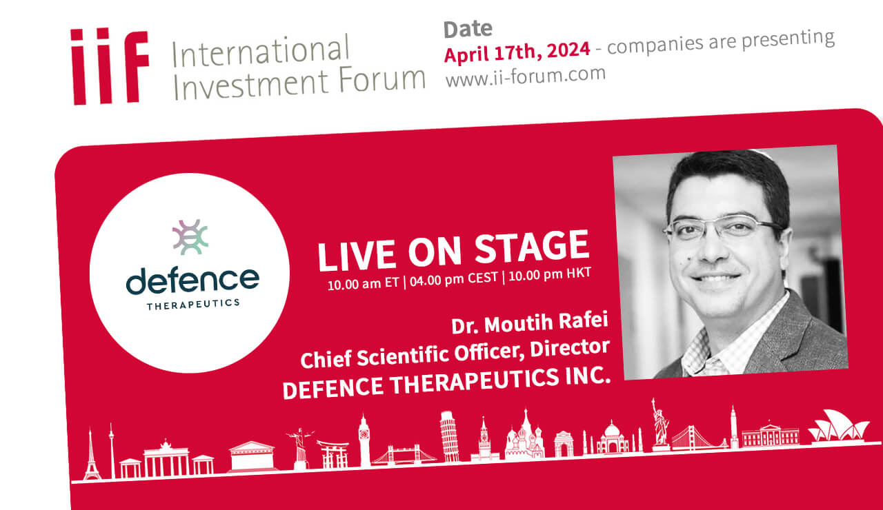 Das erfahrene Führungsteam von Defence Therapeutics besitzt eine langjährige Expertise in den Bereichen Kapitalmärkte, Finanzen, Biochemie, Pharmakologie, Biotechnologie und Immunologie. Dr. Moutih Rafei, Chief Scientific Officer und Direktor von Defence Therapeutics, ist ein Experte auf dem Gebiet der Immunonkologie mit umfassender Erfahrung in T-Zell-Entwicklung, Stammzellbiologie, Krebsimmuntherapie und Autoimmunerkrankungen. Er hat über 20 Auszeichnungen und Anerkennungen erhalten und seine Forschung hat zu zahlreichen Veröffentlichungen und Patenten geführt. Dr. Rafei steht am 17.4. im Rahmen des International Investment Forum interessierten Investoren nach seiner Live-Präsentation für Fragen zur Verfügung. Hier geht es zur Programmübersicht und kostenlosen Anmeldung.