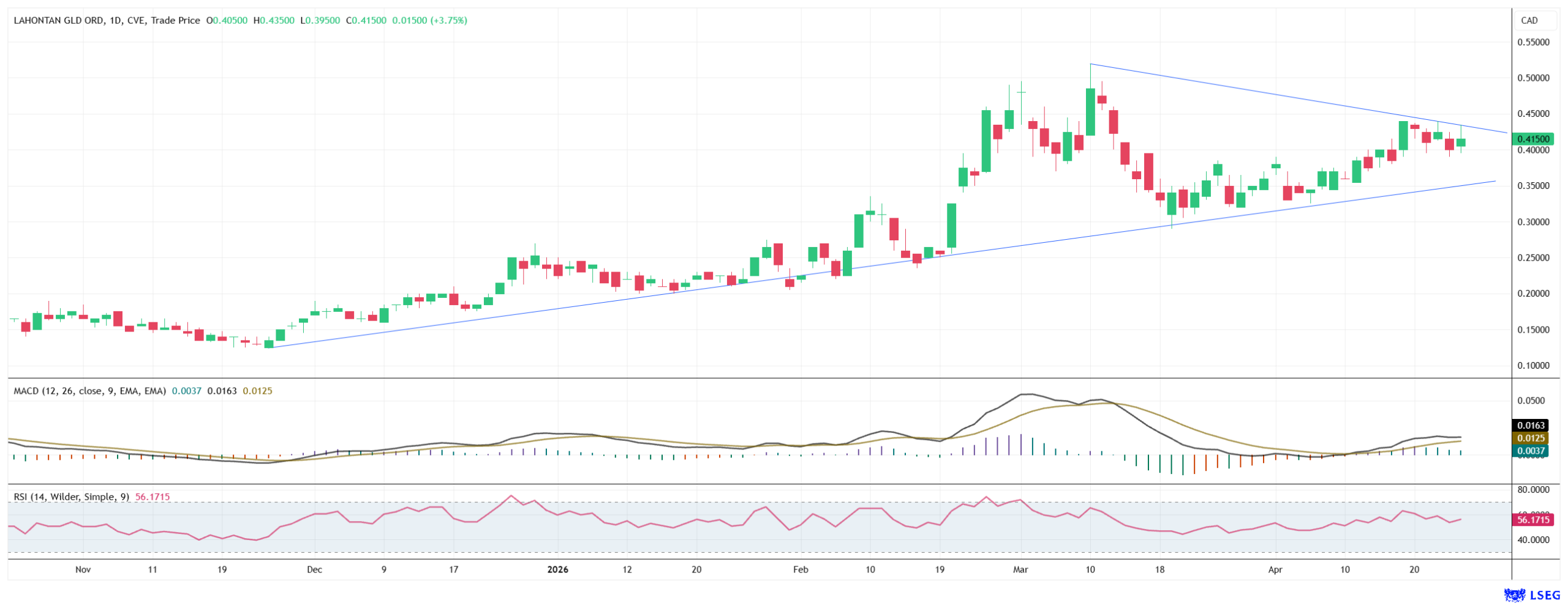 Aus charttechnischer Sicht etablierte die Lahontan-Aktie seit Januar des vergangenen Jahres einen stabilen Aufwärtstrend. Nach einer Konsolidierung notiert der Kurs nur knapp unter seinem Jahreshoch bei 0,52 CAD. Sollte dieses nachhaltig gebrochen werden, würden weit höhere Kursziele winken.