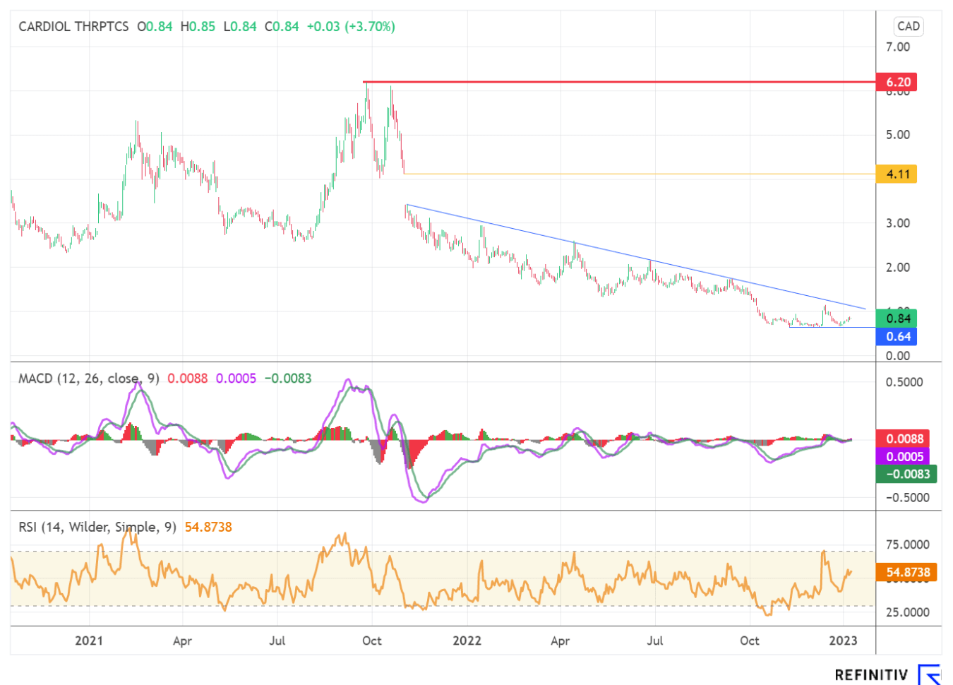 Einen Short-Squeeze erlebte auch die Aktie von Cardiol Therapeutics am Ende des abgelaufenen Börsenjahres. Hier ging es ohne Nachrichten, jedoch mit vergleichsweise hohen Umsätzen innerhalb von drei Tagen um rund 70% auf ein Zwischenhoch bei 1,16 CAD nach oben. Seither konsolidiert der Chart im Bereich 0,80 CAD. Wichtig, wie im Chartbild ersichtlich, wäre nun ein nachhaltiges Überschreiten des seit November 2021 ausgebildeten Abwärtstrends bei 1,12 CAD, um die Bodenbildungsformation abzuschließen.