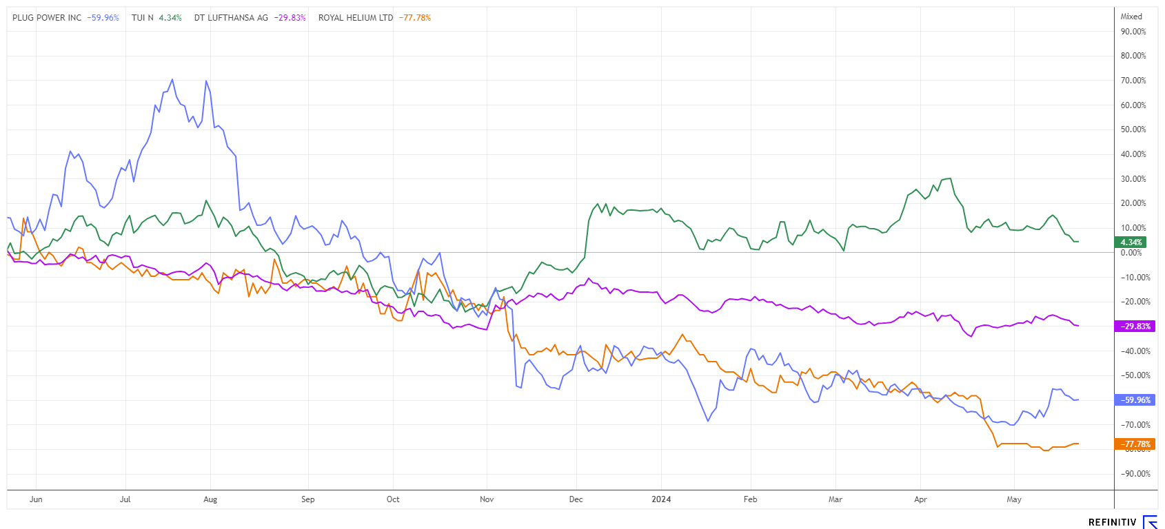 TUI AG NA O.N. | DE000TUAG505 , LUFTHANSA AG VNA O.N. | DE0008232125 , ROYAL HELIUM LTD. | CA78029U2056 , PLUG POWER INC. DL-_01 | US72919P2020
