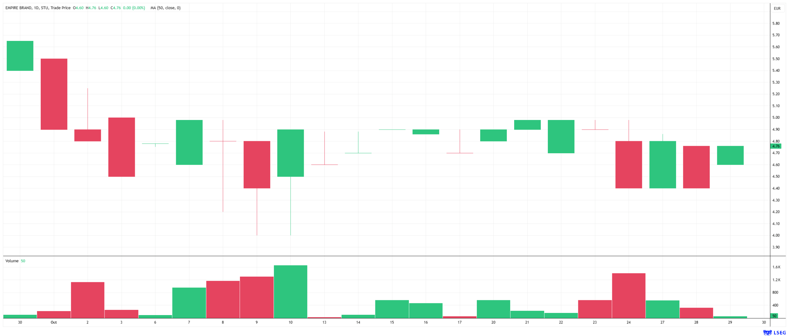 Die Aktie von Empire Brand Building entwickelt sich seit Monaten seitwärts. Trotz erfreulicher operativer Fortschritte und einer Empfehlung der Analysten von Sphene Capital, die erwarten, dass das Unternehmen bis 2027 Umsätze von rund 14,7 Mio. EUR sowie ein EBITDA von 3,1 Mio. EUR erreichen kann, verharrt die Aktie um 4,80 EUR. Setzen sich die Erfolge der vergangenen Monate fort und kann Empire Brand Building auf seinem Weg auch weiterhin möglichst viele Kundinnen und Kunden sowie Aktionäre mitnehmen, dürfte die Bewertung von aktuell knapp 20 Mio. EUR mittel- bis langfristig steigen können.