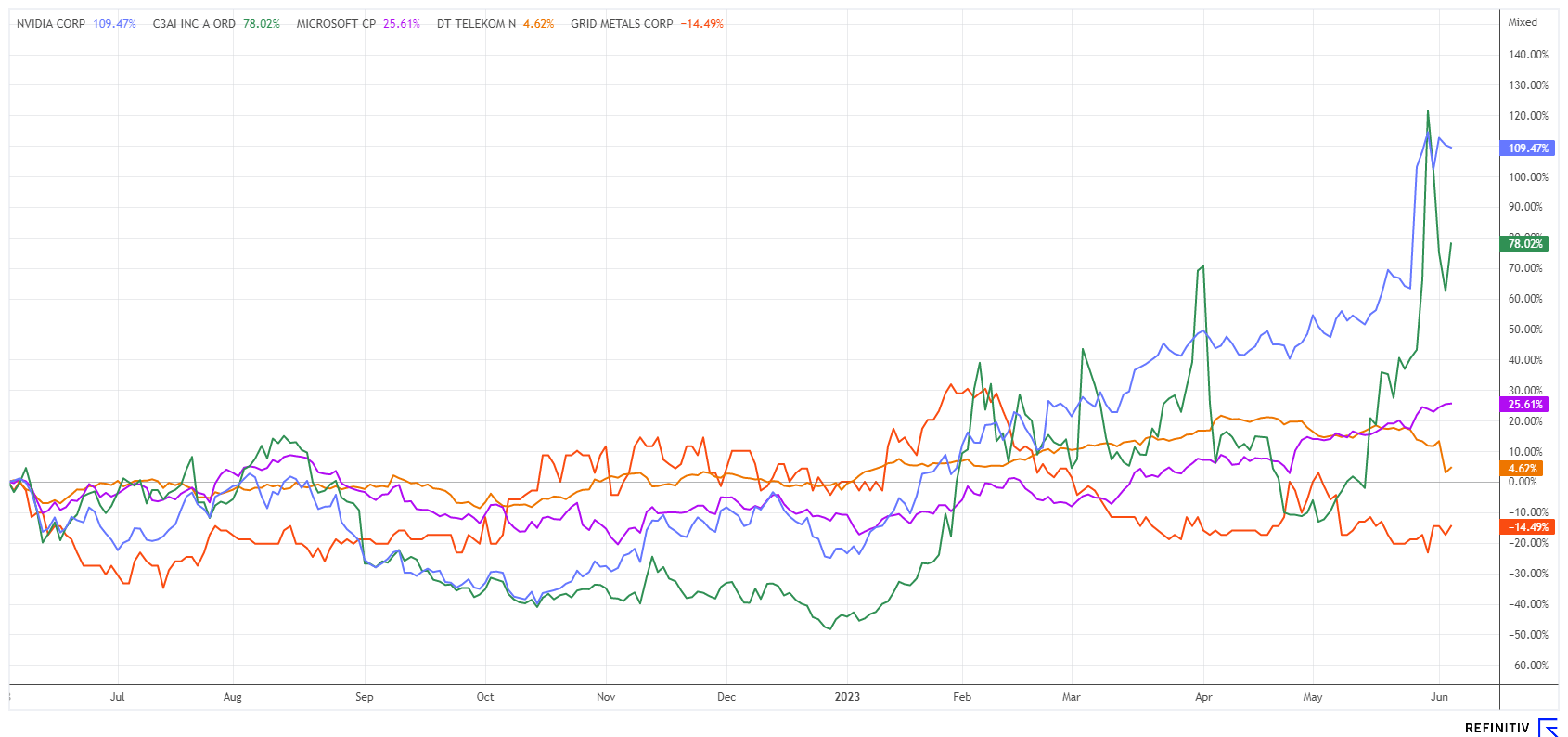 Die Börse ist keine Einbahnstraße. Das mussten einige Anleger zuletzt spüren. Denn im "Auf und Ab" der Gefühle werden immer wieder neue Trends auf den Plan gerufen. So fallen etwa die Branchen-Vertreter des Biotech-Sektors seit über einem Jahr, die Charts erreichen immer neue Tiefs. Im Jahr 2020 machten die Cannabis-Aktien Furore, der zugehörige Index POT verzehnfachte sich seit 2018 auf etwa 1100 Punkte, gestern erreichte er mit 45,5 Punkten oder 95 % Verlust ein neues Allzeit-Tief. Derzeit versuchen Anleger den Ritt mit der „Künstlichen Intelligenz“ (KI). Entsprechende Titel wie C3.ai, Nvidia, Microsoft oder Palantir liegen im Jahr 2023 dick im Plus. Hier läuft ein neuer Megatrend, der laut Experten auch noch einige Jahre anhalten wird. Wie lang dieser Boom wirklich Renditen abwirft weiß niemand. Aktuell liegen die Titel sehr gut im Rennen.
