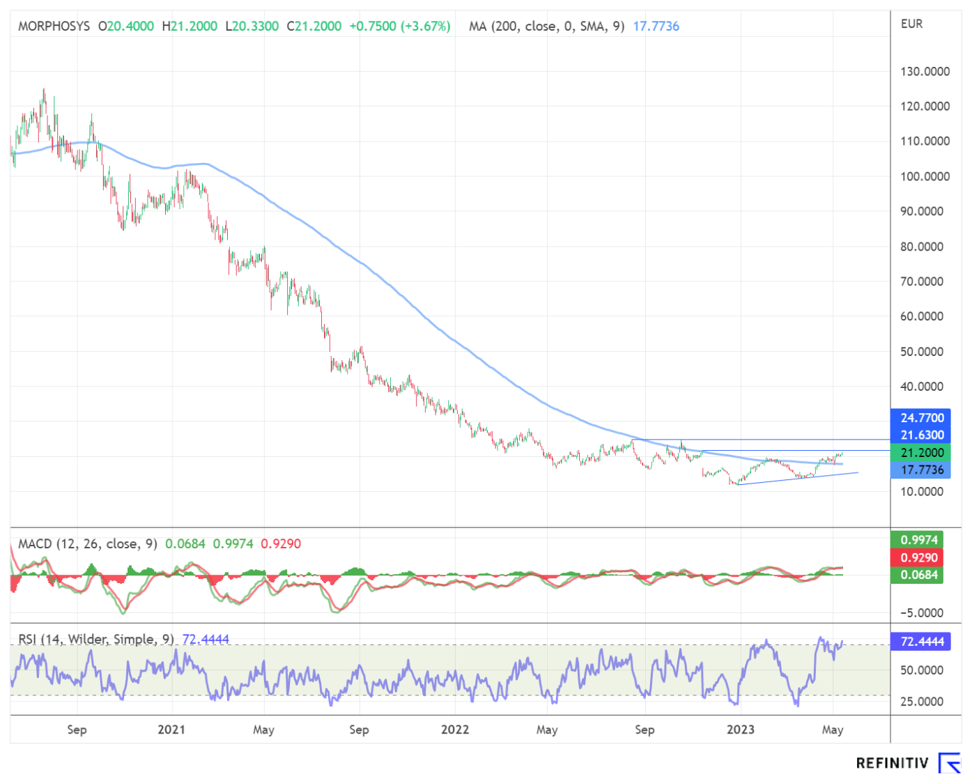 Nach dem katastrophalen Börsenjahr 2022 mit Kursverlusten von 66 % scheint der Rebound, den die Aktie Ende Dezember bei einem Tiefststand von 11,80 EUR startete, weiterzulaufen. Seither konnte Morphosys eine Kursperformance von knapp 70 % auf aktuell 21,20 EUR aufs Parkett legen. Die nächsten Widerstände liegen bereits bei 21,63 EUR und 24,77 EUR. Sollte letzterer durchbrochen werden, würde ein Kaufsignal mit einem Potenzial bis nahe an die 30 EUR-Marke generiert werden.