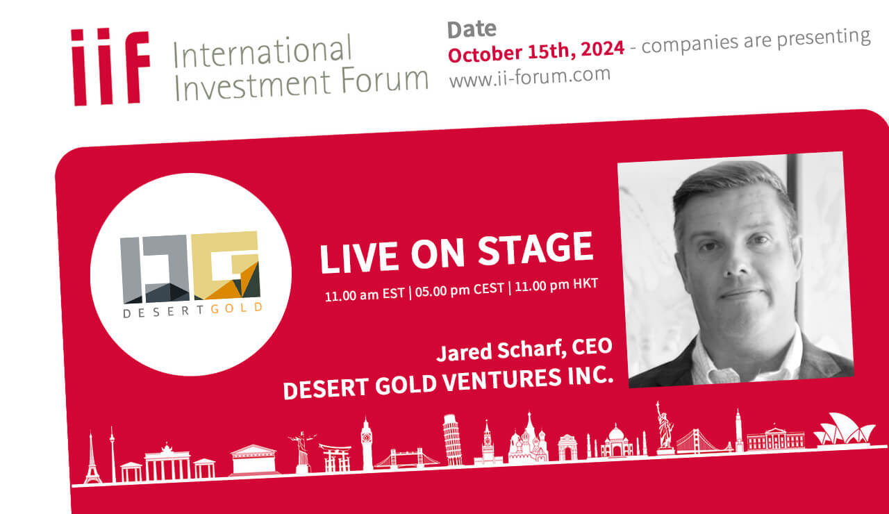 CEO Jared Scharf wird auf dem heute stattfindenden International Investment Forum um 17 Uhr CET ein Update zu Desert Gold geben. Hier geht´s zur Anmeldung.