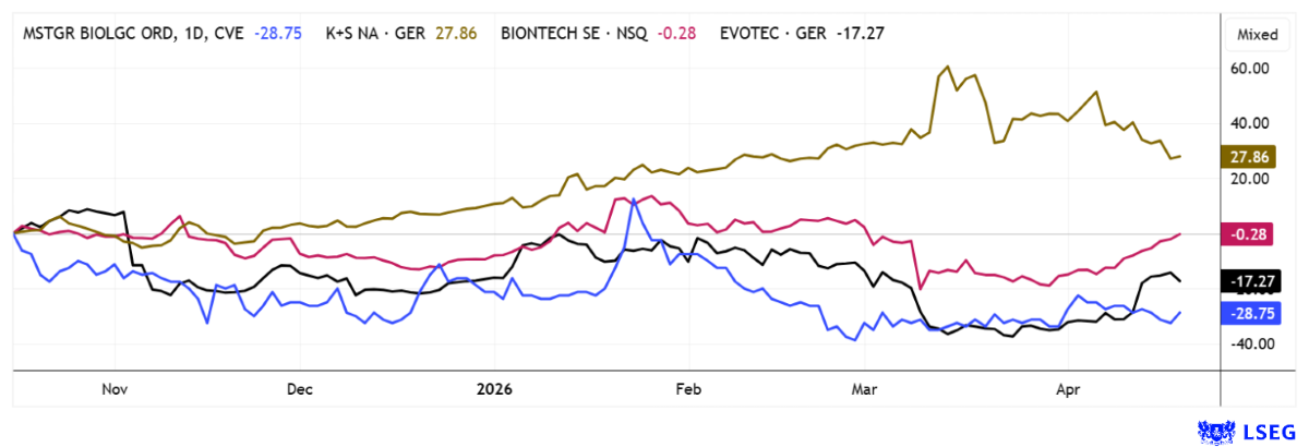 MUSTGROW BIOLOGICS CORP. | CA62822A1030 | TSXV: MGRO , OTCQB: MGROF , BIONTECH SE SPON. ADRS 1 | US09075V1026 , EVOTEC SE INH O.N. | DE0005664809 , K+S AG NA O.N. | DE000KSAG888