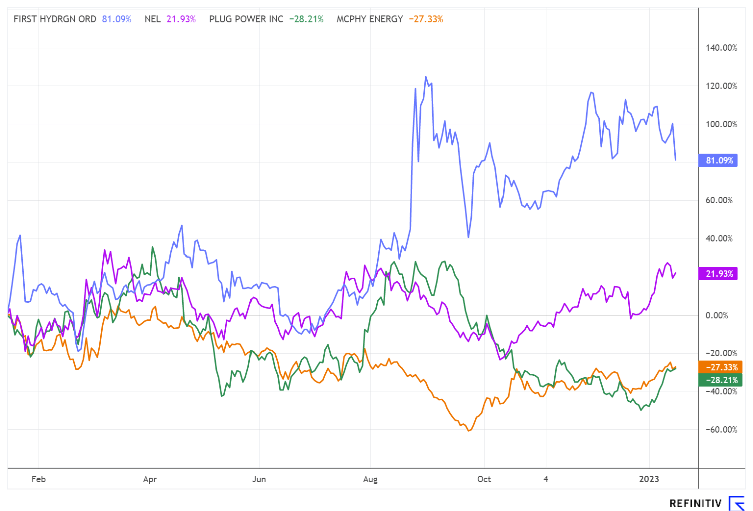 Wasserstoff ist existenziell für den Erfolg der Klimawende. Trotzdem korrigieren die immer noch mit hohen Bewertungen ausgestatteten, defizitären Unternehmen wie Nel Asa oder Plug Power. Im Gegensatz dazu schieben sich Unternehmen aus der zweiten Reihe in den Vordergrund. First Hydrogen ist dabei bestrebt, die komplette Wertschöpfungskette der Wasserstoffindustrie abzudecken. Landi Renzo konnte trotz schwieriger Marktbedingungen seinen Wachstumskurs fortsetzen.