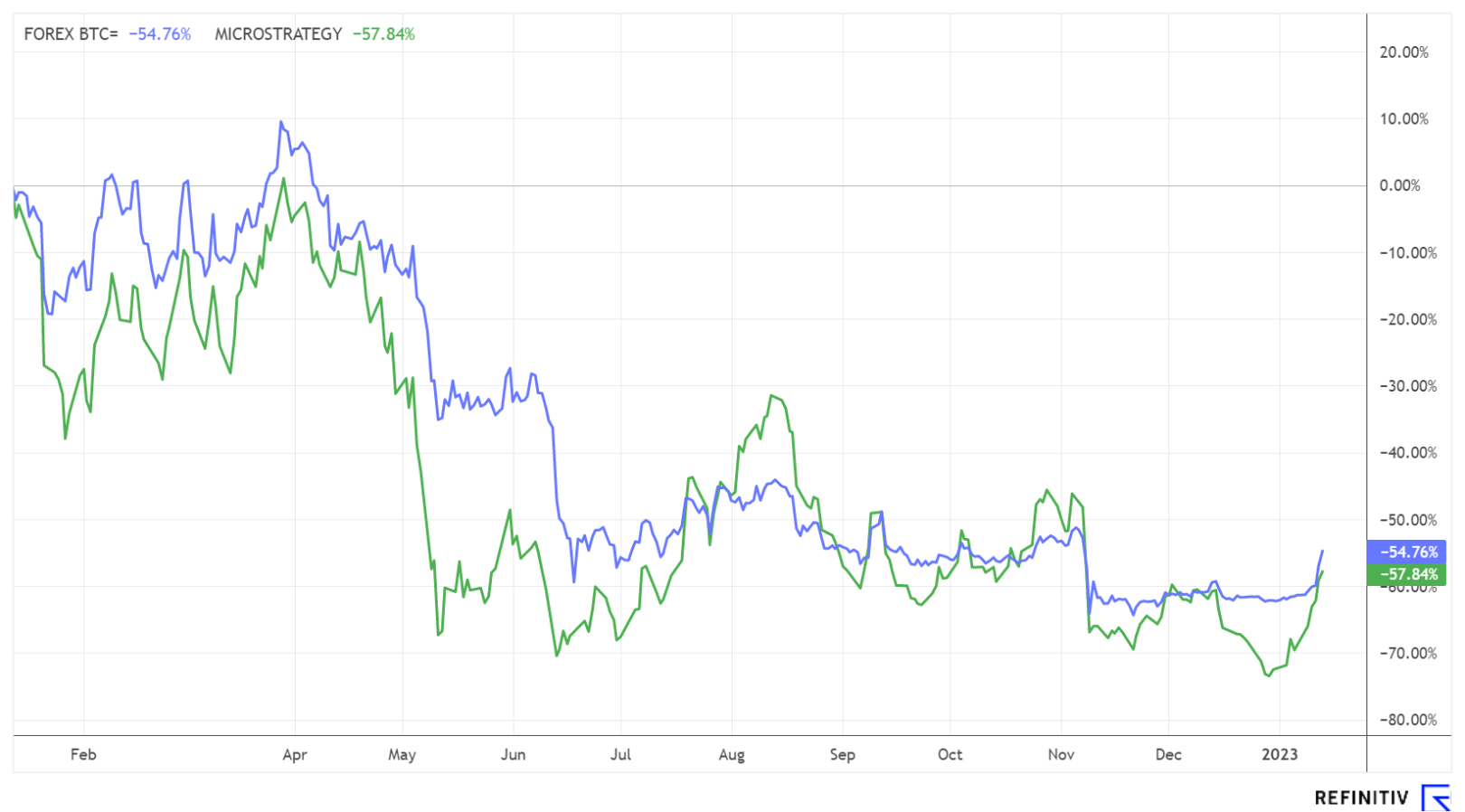 Noch im alten Jahr wurden die Bestände nochmals um 2.000 Coins erweitert. Insgesamt investierte das Unternehmen 4,03 Mrd. USD und einem durchschnittlichen Kaufpreis von ca. 30.397 USD. Sollte der Krypto-Markt langfristig drehen, gilt die MicroStrategy-Aktie aufgrund steuerlicher Gesichtspunkte zu einer echten Alternative zu einem Direktinvestment in den Bitcoin.