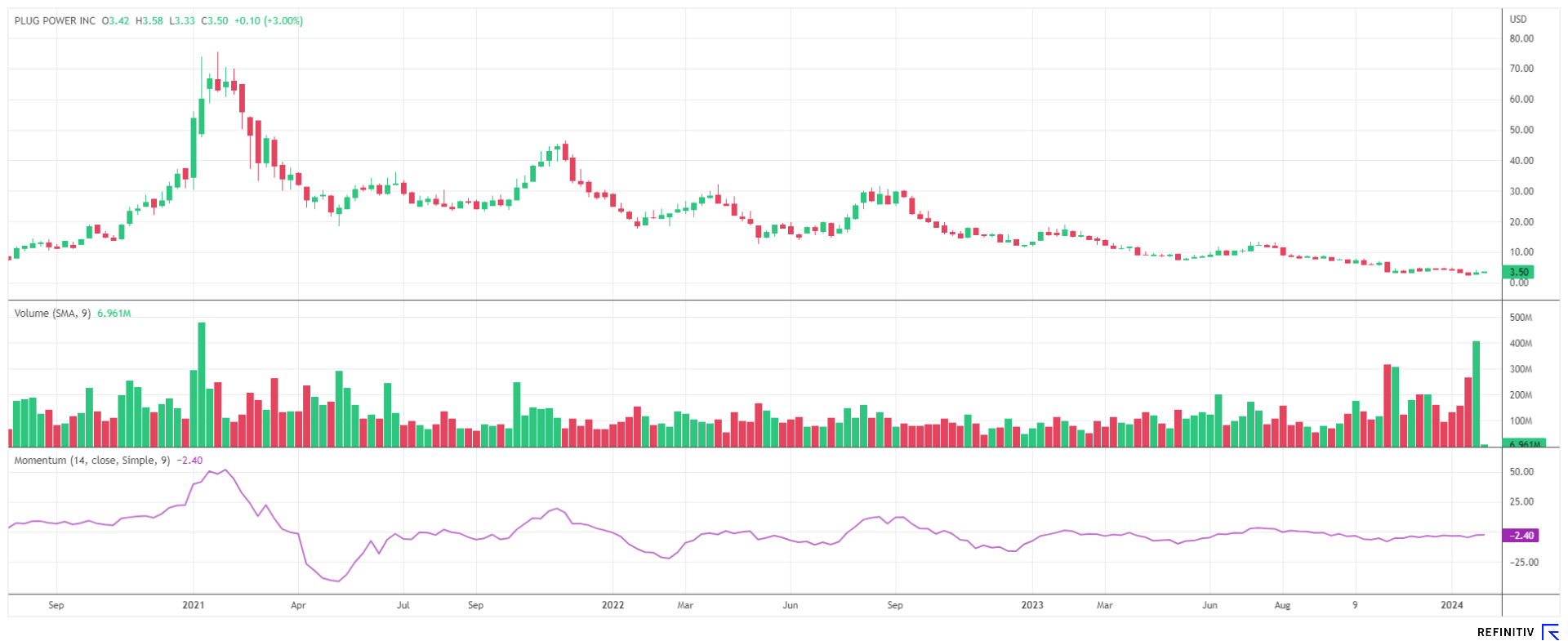 In Sachen Plug Power scheiden sich die Geister. Bis auf 2,45 USD fiel der Kurs wie ein Stein, als das Management eine 1 Mrd. USD-Finanzierung über die Börse angekündigt hat. Dabei werden die Aktien nicht den Altaktionären angeboten, sondern von den Investmentbanken „zum besten Preis“ über den Markt platziert. Plug Power braucht weitere Eigenmittel, denn schon bald soll in Georgia das größte US-Wasserstoff-Kraftwerk an den Start gehen. Für die Gesamtplanung der Giga-Anlage ist eine 1,6 Mrd. USD Kreditlinie des Department of Energy (DOE) nötig. Sie ist aber wiederum an ausreichend Eigenkapital gebunden.