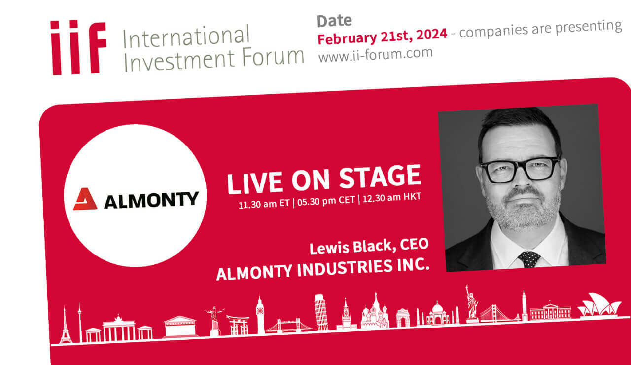 Am kommenden Mittwoch, den 21. Februar 2024, wird CEO Lewis Black live beim 10. International Investment Forum präsentieren. Die Teilnahme am virtuellen Event ist kostenlos.