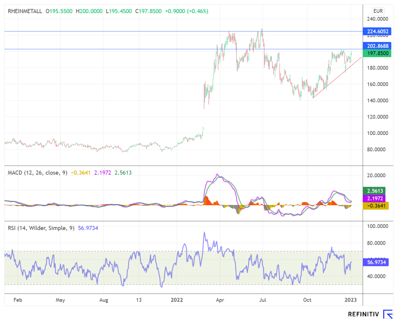 Der beständig starke News Flow führte die Aktie erneut nahe an ihre Ausbruchslinie bei 202,87 EUR. Sollte diese nachhaltig überwunden werden, dürfte ein erneutes Anlaufen an die Hochs des Jahres 2022 bei 227,90 EUR wahrscheinlich sein.
