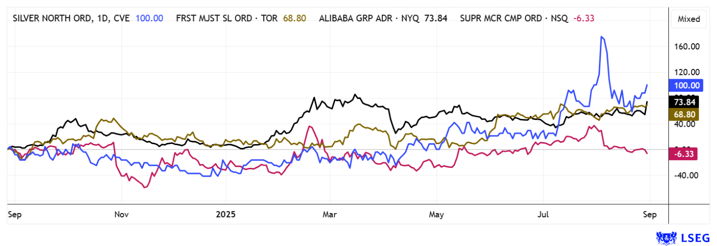 Edelmetalle starten mit starken Aufschlägen in den schwierigen Börsenmonat September. Technisch sauber konnte Gold die Marke von 3.400 USD zurückerobern, im Ausbruch über 40 USD befindet sich Silber. Beim Explorer Silver North gibt es mit der Zone Veronica beste Chancen auf einen weiteren bedeutenden Silberfund in einem aufstrebenden Distrikt. Gut im Trend liegt auch der Produzent First Majestic. Die Technologie-Titel Alibaba und SMCI zeigen unterschiedliche Qualitäten.