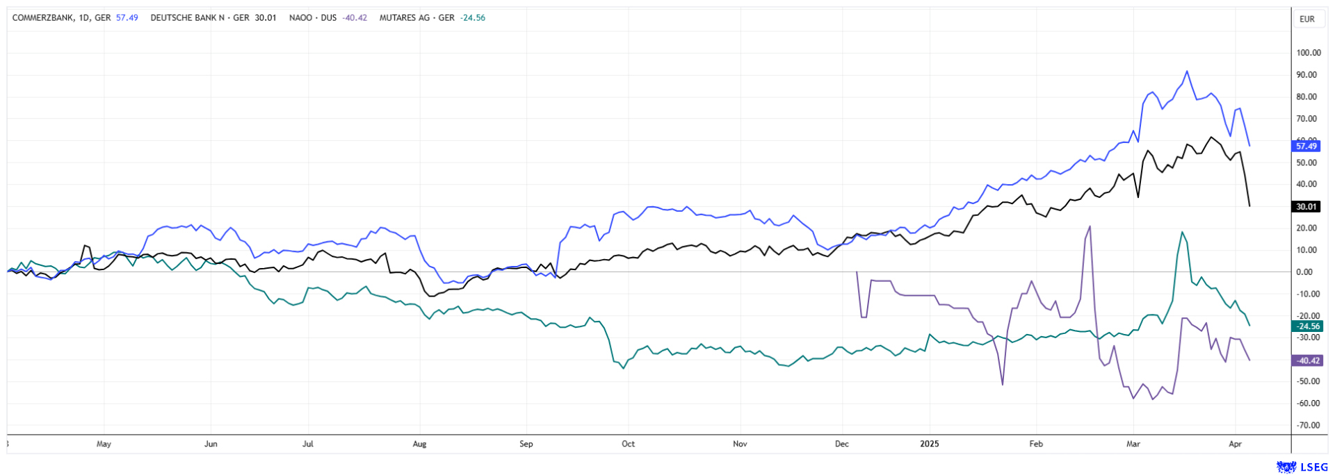 Wie vom Blitz getroffen wurden die Aktien der Deutschen Bank und der Commerzbank. Der Grund: Die Erhebung von Zöllen könnte die Konjunktur einbrechen lassen und die eh im Steigflug begriffenen Insolvenz-Quoten weiter anheizen. Viele Anleger traten daher erneut den Rückzug an, vor allem im konjunktursensiblen Bankensektor. Der europäische Bankenindex sackte in der Spitze um 9 % ab, im DAX fielen die Titel der Deutschen Bank und der Commerzbank in der Gesamtwoche zwischen 15 und 20 %.