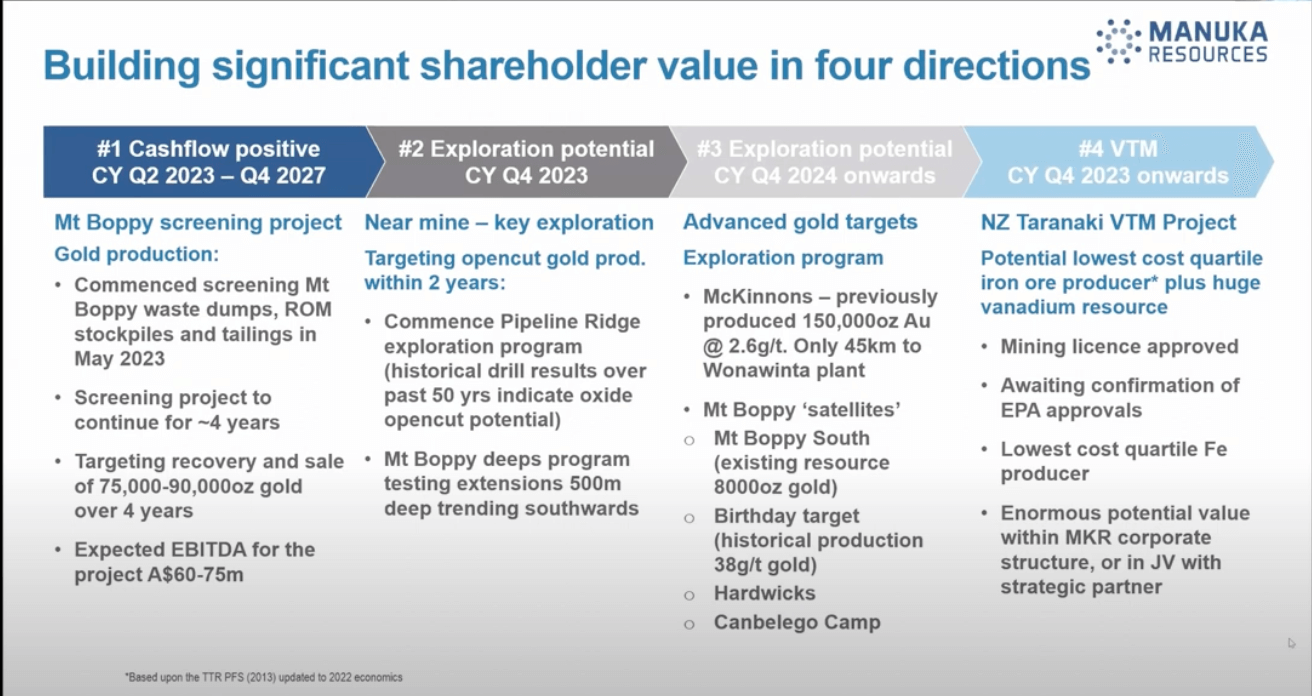 Dennis Karp zeigte in seiner Präsentation eine klare Roadmap, um dem Aktienkurs von Manuka auf die Sprünge zu helfen. Zum einen sei Mt Boppy inzwischen Cashflow positiv und wird bis 2027 ein positives operatives Ergebnis (EBITDA) von 60 bis 75 Mio. AUD erwirtschaften. In Q4 soll es dann gleich mehrere Bohrergebnisse von mehreren Projekten geben. Weitere Projekte werden in 2024 berichten. Und dann ist da natürlich South-Taranaki-Bight. Hier soll es in den kommenden Monaten ebenfalls weiteren Newsflow geben. Dies alles gibt es derzeit für gerade einmal 25 Mio. AUD. Zum Vortrag von Dennis Karp geht es hier.