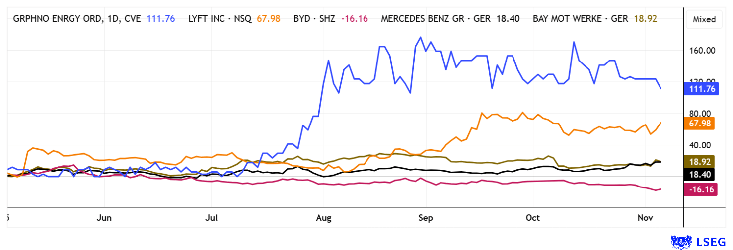 BYD CO. LTD H YC 1 | CNE100000296 , Graphano Energy Ltd. | CA38867G2053 , MERCEDES-BENZ GROUP AG | DE0007100000 , BAY.MOTOREN WERKE AG ST | DE0005190003 , BAY.MOTOREN WERKE VZO | DE0005190037