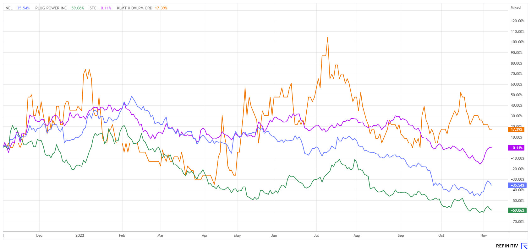 Die Wende kam adhoc und sehr heftig. Noch vor einigen Tagen befanden sich DAX, NASDAQ und die Wasserstoffwerte im freien Fall, aber mit Beginn des Novembers drehte sich das Blatt. Der DAX 40 vollzog einen 600-Punkte Freudensprung nach oben, weil die Notenbanken dies und jenseits des Atlantiks endlich stillhalten und nun für das Jahr 2024 erste Zinssenkungen erwartet werden. Bei den Wasserstoff-Protagonisten gab es in nur 6 Monaten Abschläge von bis zu 70 % - ein Drittel davon konnten Nel & Co aber bereits wiedergutmachen. Wie geht es weiter mit den GreenTech-Werten?