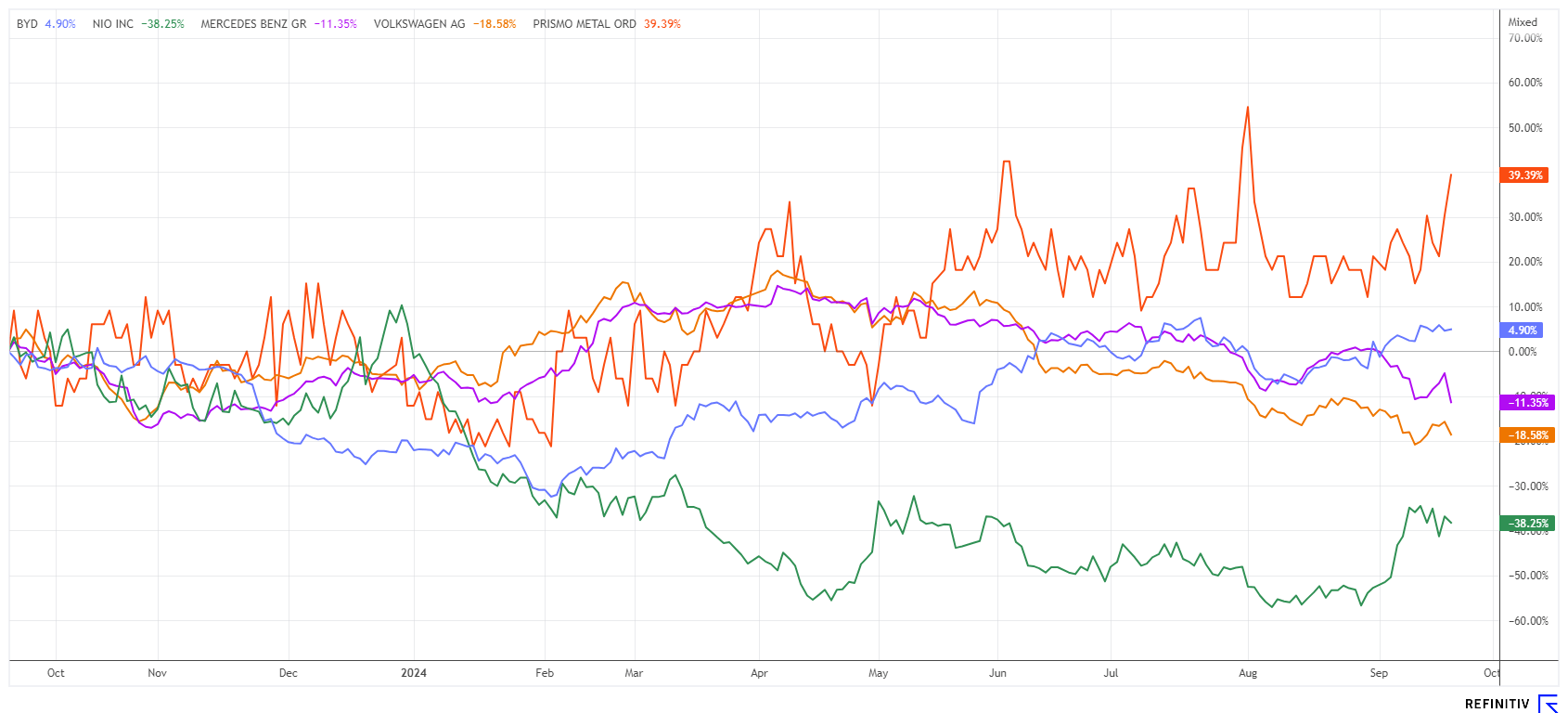 VOLKSWAGEN AG VZO O.N. | DE0007664039 , PRISMO METALS INC | CA74275P1071 , BYD CO. LTD H YC 1 | CNE100000296 , NIO INC.A S.ADR DL-_00025 | US62914V1061 , MERCEDES-BENZ GROUP AG | DE0007100000
