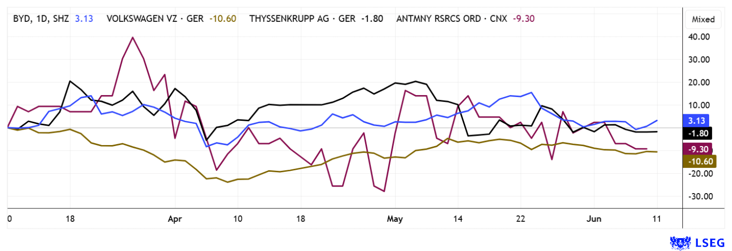 THYSSENKRUPP AG O.N. | DE0007500001 , VOLKSWAGEN AG VZO O.N. | DE0007664039 , VOLKSWAGEN AG ST O.N. | DE0007664005 , BYD CO. LTD H YC 1 | CNE100000296 , ANTIMONY RESOURCES CORP | CA0369271014