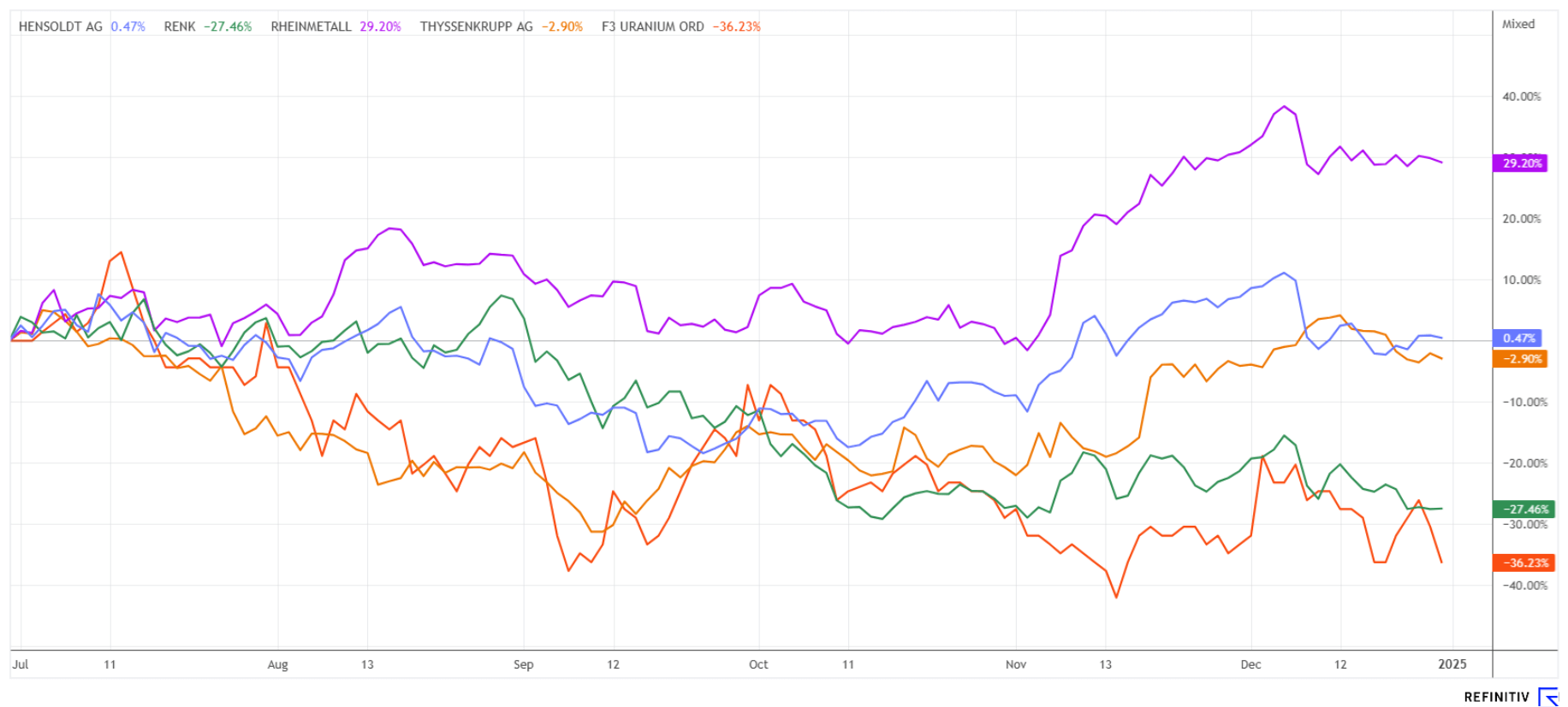 Anleger blicken für das Jahr 2024 auf eine insgesamt versöhnliche Kursentwicklung im Rüstungs-Sektor zurück. Blockbuster in Deutschland war die Rheinmetall-Aktie gefolgt von MTU, Hensoldt und Airbus. Hoffnungsvoll gestartet war auch der Zahnrad- und Getriebespezialist Renk mit einer schnellen Kursverdoppelung, aber auch einer anschließenden Halbierung. Zum Jahreswechsel gibt es einen neuen CEO, der den Konzern nach schwachen Zahlen und einem verhaltenen Ausblick wieder auf Rendite trimmen soll. Die Analysten auf der Plattform Refinitiv Eikon haben ihren 12-Monatskonsens von 38 auf ca. 30,50 EUR zurückgenommen, aber immer noch sind 11 von 13 Experten mit einer Kaufempfehlung im Markt. Sollte Dr. Alexander Sagel sein Streamlining schnell erledigen, könnte die Renk-Aktie in 2025 wieder zu den Gewinnern gehören.