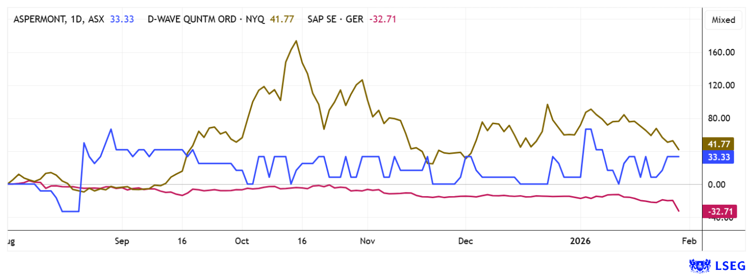 Die Aktienmärkte befinden sich aktuell in einem von erhöhter Schwankungsintensität geprägten Umfeld, gleichwohl sorgen sektorale Trends und thematische Anlagestorys für Aufmerksamkeit. Aspermont erscheint derzeit perfekt positioniert, bei D-Wave Quantum bleibt die Bewertung trotz der jüngsten Korrektur klar zukunftsorientiert. SAP verfügt nach den Rücksetzern über ein deutlich verbessertes Chancen-Risiko-Profil, da viel Negatives im aktuellen Kursniveau bereits eingepreist ist.