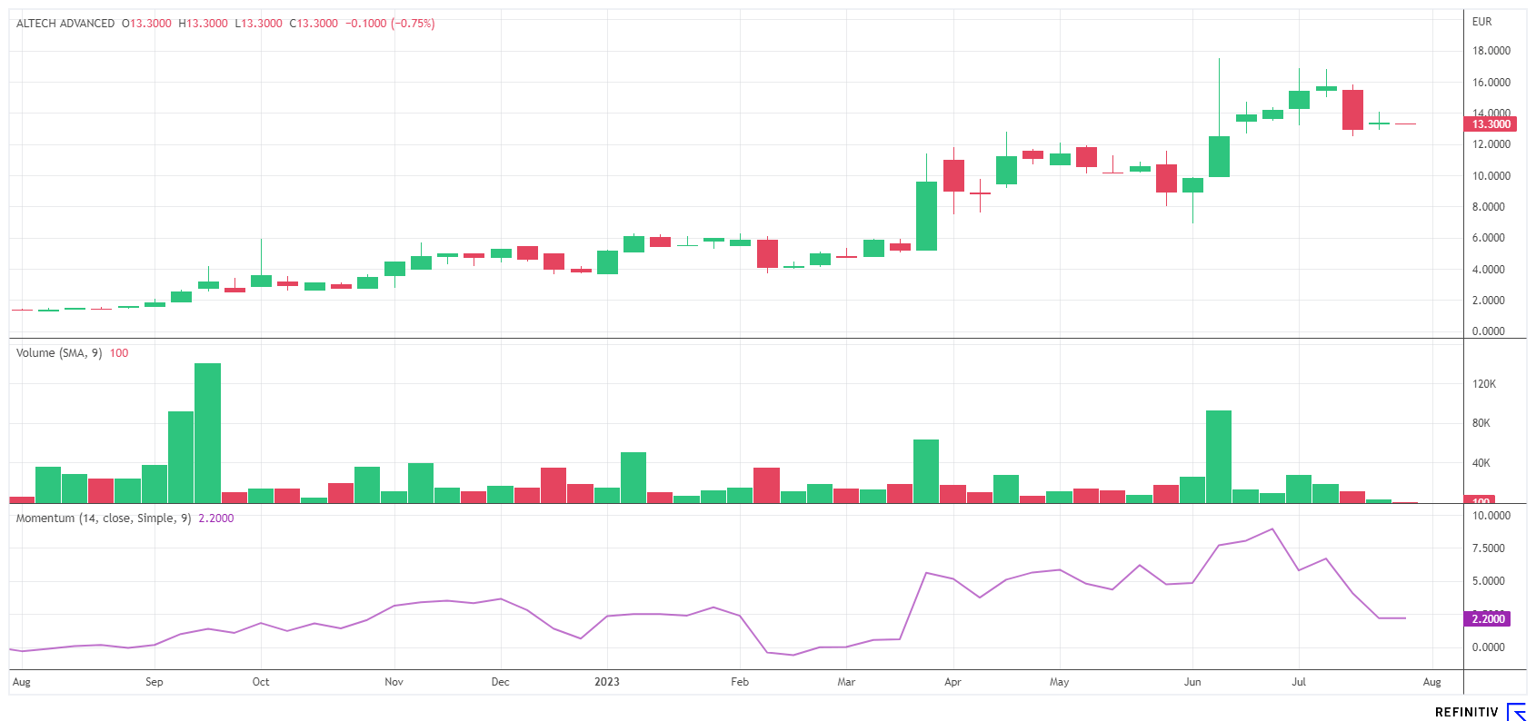 Die AAM-Aktie liegt in 2023 schon über 400 % im Plus, das erfordert Mut beim Einsteigen. Doch die Aktien des Batterie-Sektors sind zurzeit heiß begehrt, das sollte auch die AAM-Aktie weiter beflügeln. Nach einer zarten Konsolidierung vom Top bei 17,50 EUR kann man derzeit wieder Stücke bei 13,50 EUR erwerben. Langfristig stehen die Ampeln auf Grün.