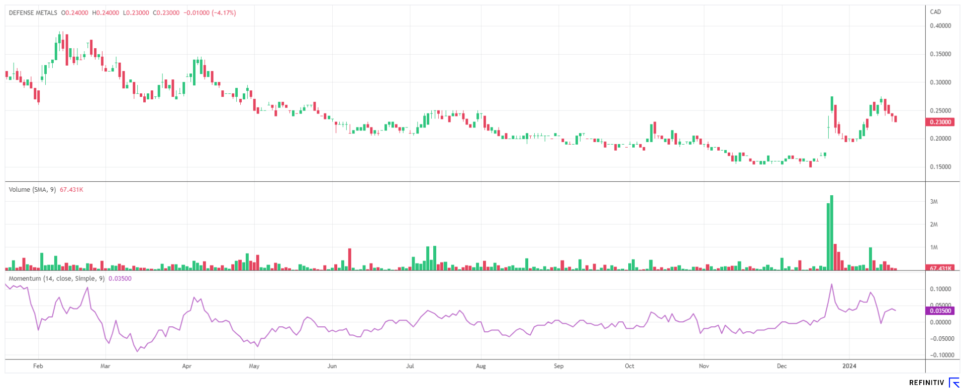 Diese Kooperation ist wieder eine gute Nachricht für die Defense Metals-Aktie. Die Umsätze haben sich in den letzten Tagen zu den sonst üblichen Volumina bereits vervierfacht und der Kurs hat seit Dezember bereits 70 % zugelegt. Bei der Brisanz des Themas „Seltene Erden“ können nun auch weitere größere Transaktionen erwartet werden. Höchst spannend.
