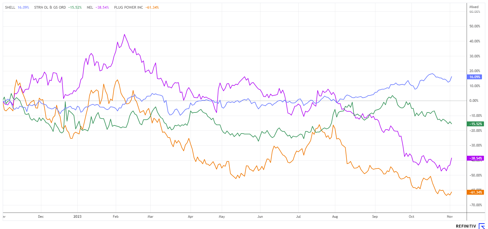 Nach monatelangem Ausverkauf bei DAX, NASDAQ & Co. setzte die Börse Anfang November zu einer Rally ein. Die Kursverlierer von gestern sind nun die Kursgewinner, natürlich mit viel Spekulation und Rückenwind von den stillhaltenden Notenbanken. Das alles kann zwar nicht über eine Rezession in Europa hinwegtäuschen, aber die Börse blickt ja bekanntlich 9 Monate nach vorne. Nel ASA und Plug Power bleiben spekulativ interessant, Shell und Saturn Oil & Gas überzeugen durch ihre niedrige Bewertung.