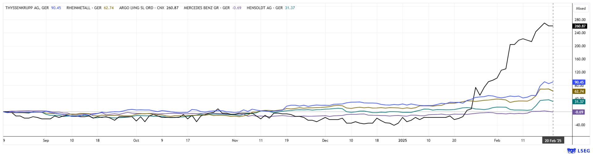 Der Aufstieg an den Börsen ist ziemlich weit fortgeschritten. Das Dilemma zeigt sich erst richtig, wenn Zahlen unter den Erwartungen veröffentlicht werden und die Aktien in den freien Fall übergehen. Highflyer Palantir hat es gestern mit -25 % erwischt. Innerhalb unserer Selektionsliste legen wir den Fokus auf die thyssenkrupp AG und Argo Living Soils. Hier sollte es noch deutlich weiter nach oben gehen. Vorsicht bei Rheinmetall und Hensoldt, die Bewertung ist ungewöhnlich hoch.